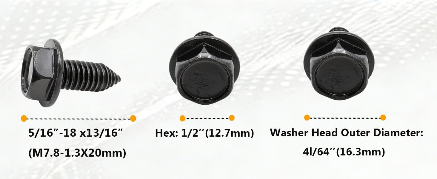 Size: 5/16”-18 x 13/16", Washer Head Outer Diameter: 41/64”, Hex: 1/2” , Anti-Corrosion Black Zinc Plated. Includes 20 pcs.