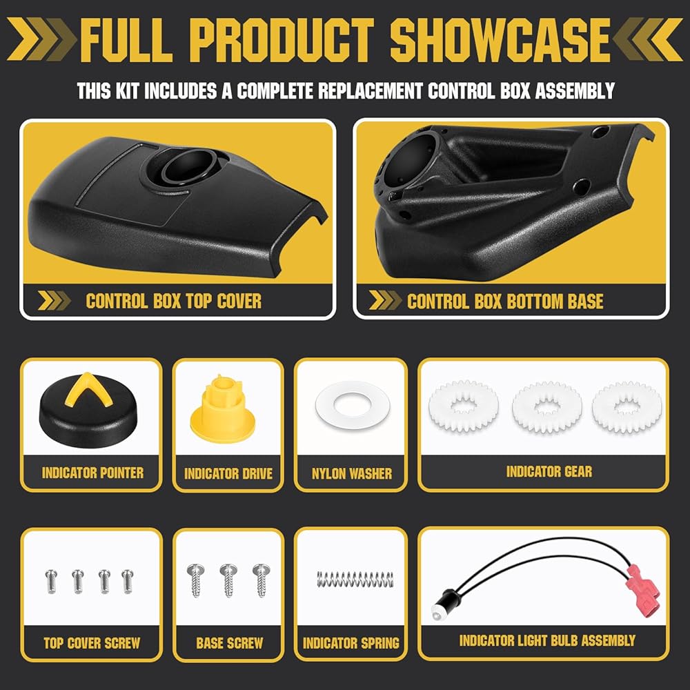 ALL-IN-ONE REPLACEMENT KIT – Includes top cover (2280202), bottom base (2282500), indicator pointer, springs, yellow/white gears, nylon washer, decal, indicator light assembly, and all necessary mounting screws.