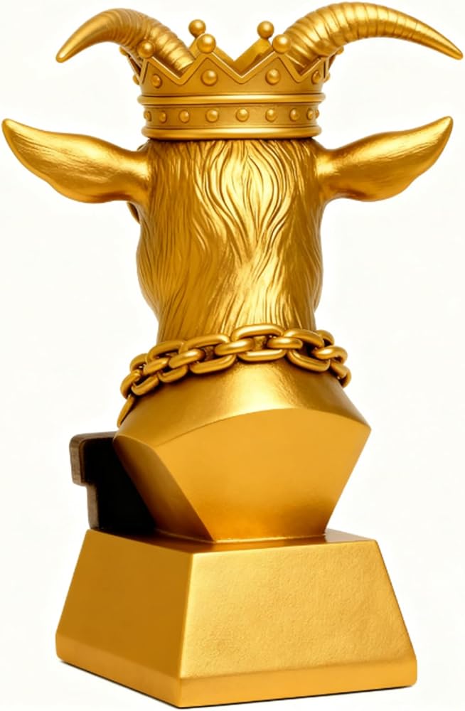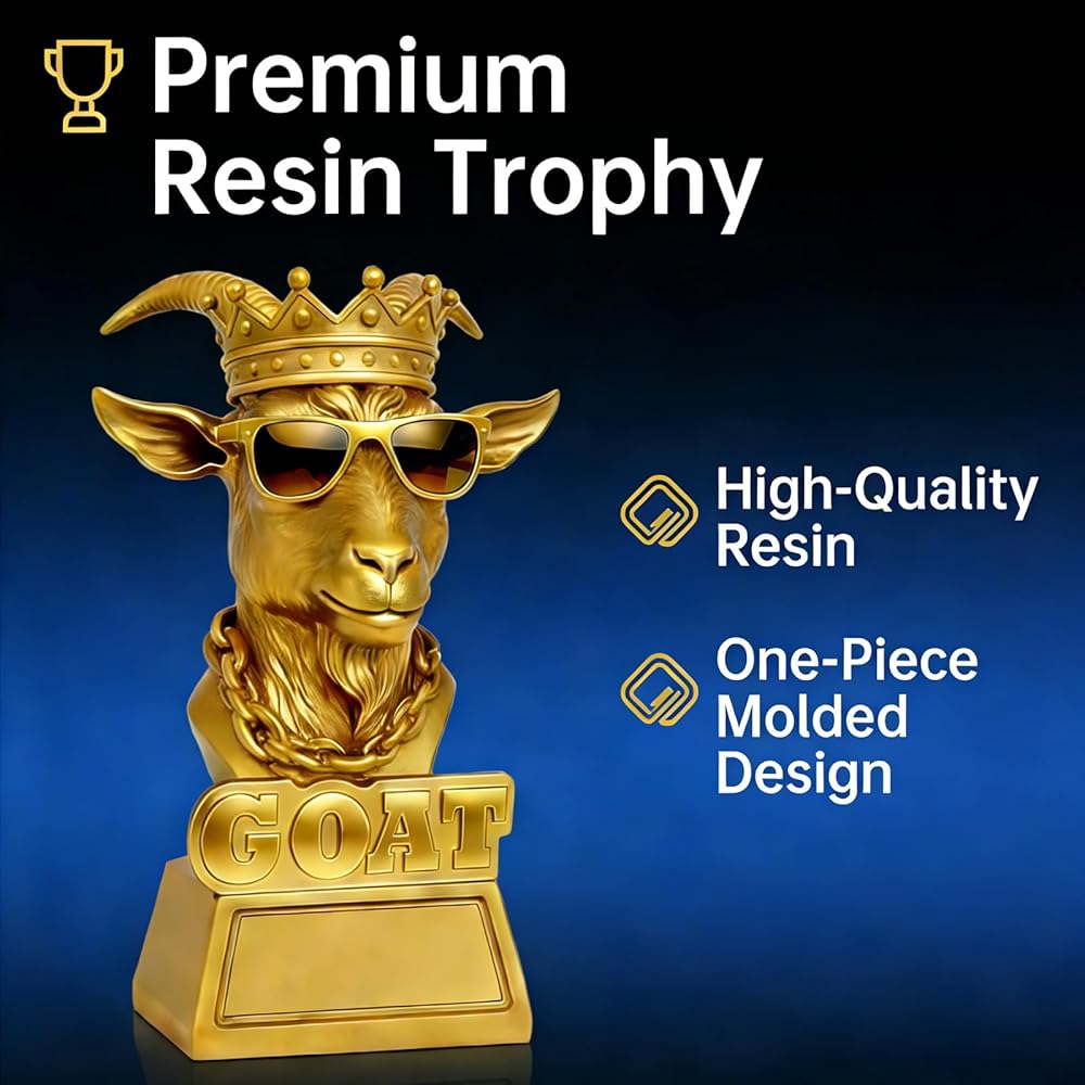 Iconic G.O.A.T. Design — Featuring a goat wearing stylish sunglasses, a crown, and a bold gold chain. This trophy boldly declares itself as the greatest of all time.