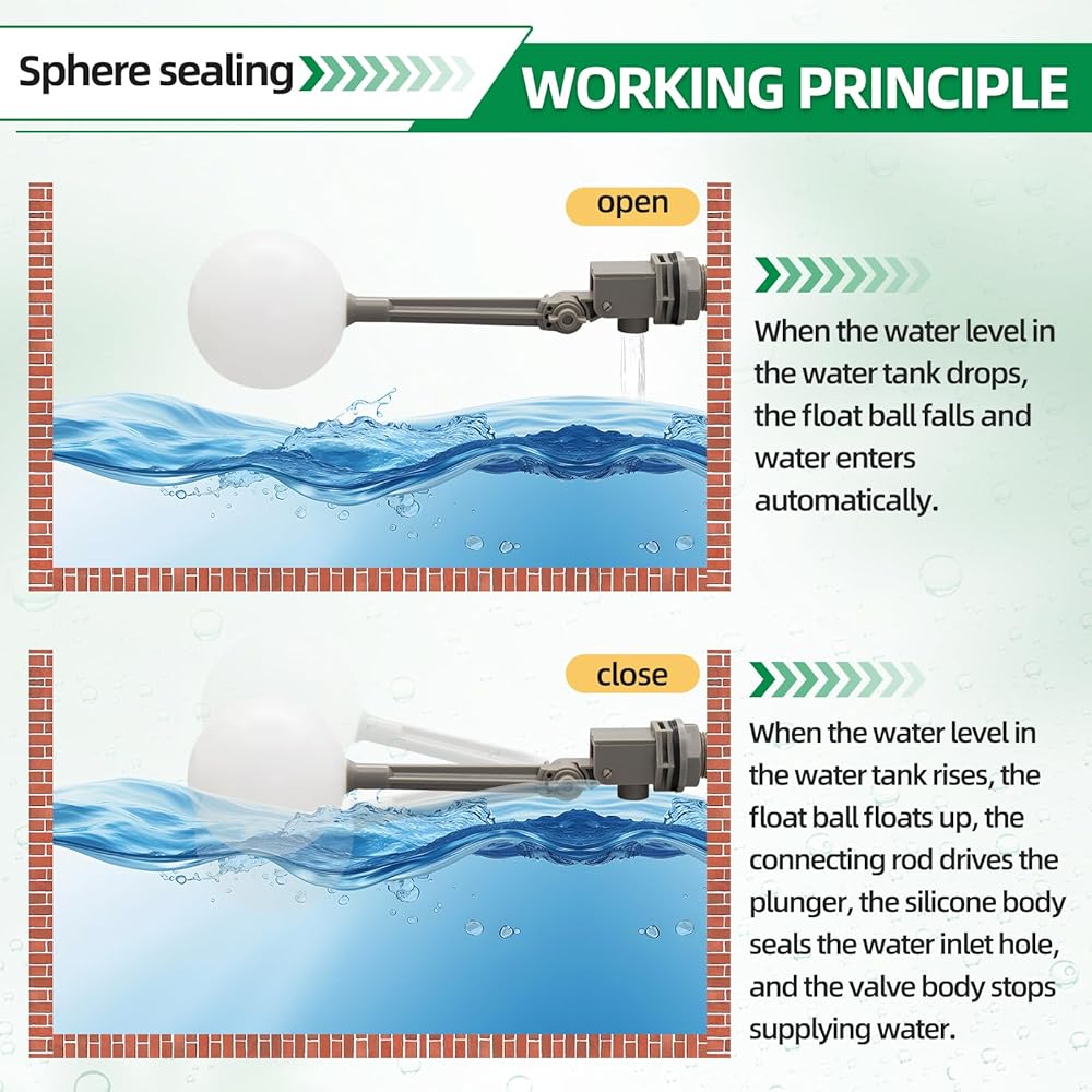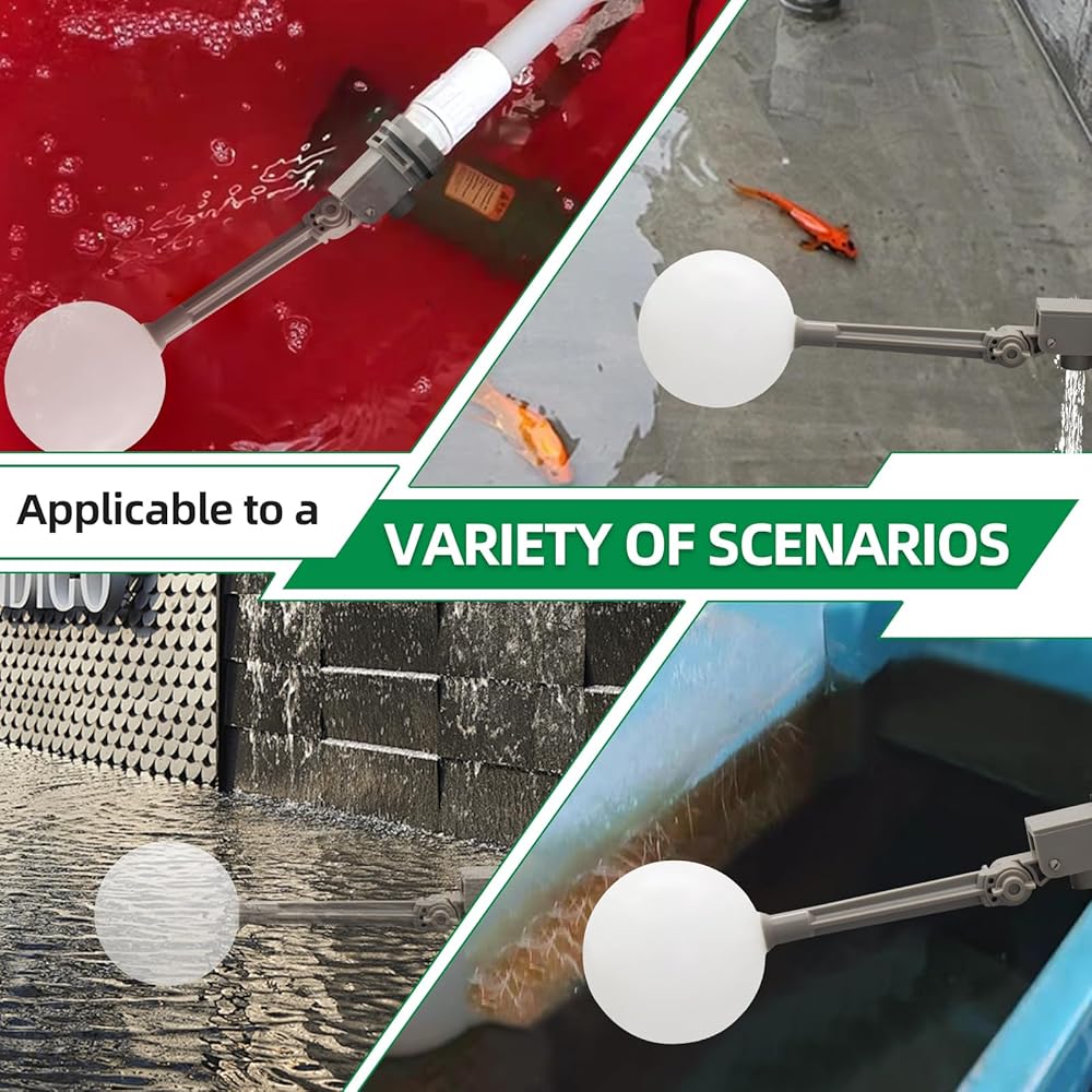Adjustable arm: The water float valve with adjustable arm provides an adjustment range of over 180 degrees. PVC screws facilitate this adjustment while also providing rust and oxidation resistance, ensuring longevity and high efficiency performance.