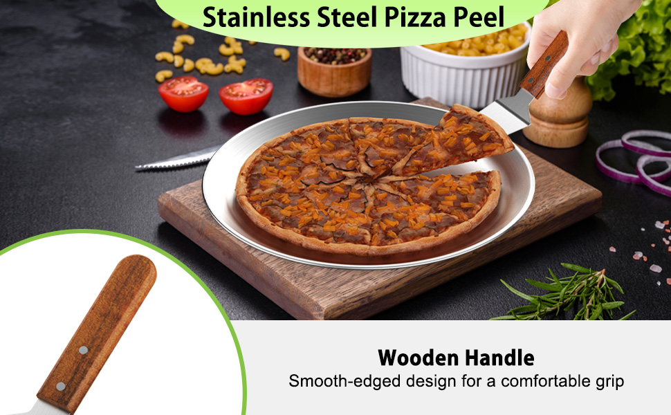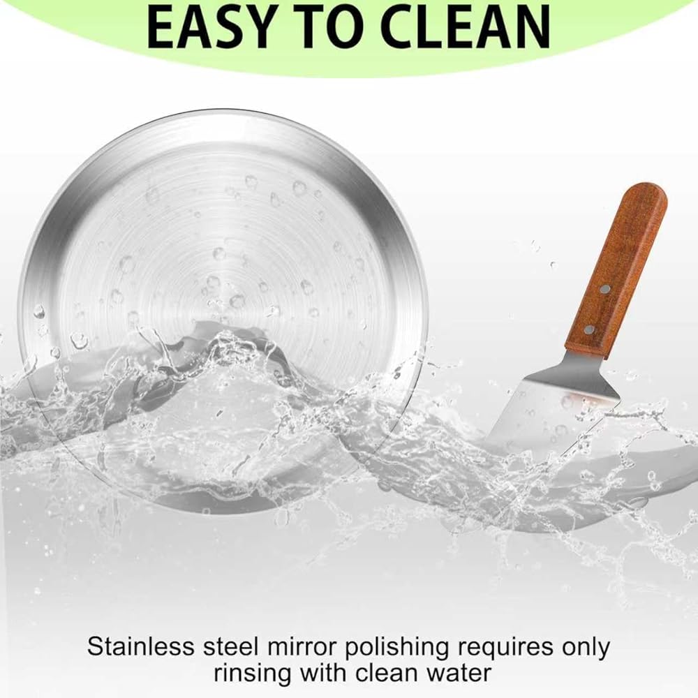 Pizza Pan Riser Stands Kit - Includes 4 metal pizza table stands, 4 stainless steel pizza pans, and 2 wooden-handled pizza servers for restaurants, bars and cafe settings, or for the enthusiastic at home chef