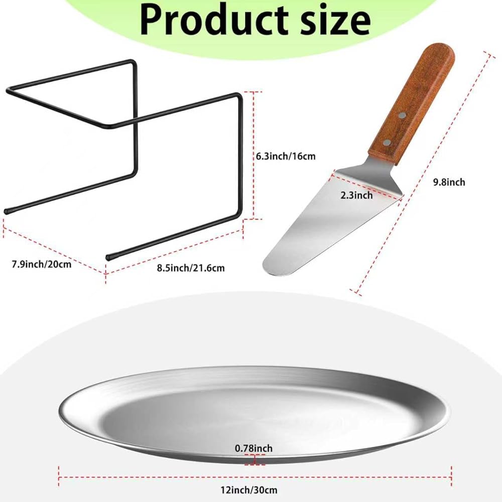 Pizza Stand Dimensions - 7.9 "W× 8.5 "D× 6.3 "H. Pizza rack is suitable for pizza tray sizes of 9" - 12". They're not just practical, they're also stylish and suitable for parties of different style