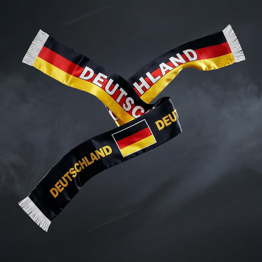 Picture the stadium buzzing as the teams walk out, the national anthem building, the cameras sweeping across the stands. You lift your Germany soccer scarf above your head and suddenly you are part of that moment, a bright stripe of black, red and yellow in a sea of noise. This satin DEUTSCHLAND scarf is made for that feeling. One side features a full-length flag stripe with bold “DEUTSCHLAND” lettering, while the reverse shows the word repeated with a centered German flag, so your support is visible from every angle. The smooth satin fabric feels great against the skin, gliding over jerseys and jackets instead of pulling or scratching. Because it is lightweight, you can wear the german flag scarf comfortably through kickoff, halftime chats and extra time without wanting to take it off. At about 5.5 x 53 inches, it has enough length to wrap for warmth on cool nights or to hold high when Germany lines up a free kick, yet the slim shape keeps it easy to manage in crowded stands and at packed watch parties. White fringe on both ends adds a little swing to every chant and wave, giving photos and videos a sense of motion and excitement. This Germany supporter scarf easily moves from stadium to street. Throw it on for Bundesliga viewing parties, international tournaments, friendly matches or fan meetups. It looks just as good hanging from a wall or draped over a sofa between games as it does around your neck on match day. The neatly stitched edges and strong colors are designed for repeated use, so it becomes a familiar piece of germany fan gear you reach for whenever there is a big fixture coming up. Use this Germany soccer scarf to complete your game day ritual, add energy to every celebration and keep the black red yellow colors close whenever you cheer for DEUTSCHLAND.
