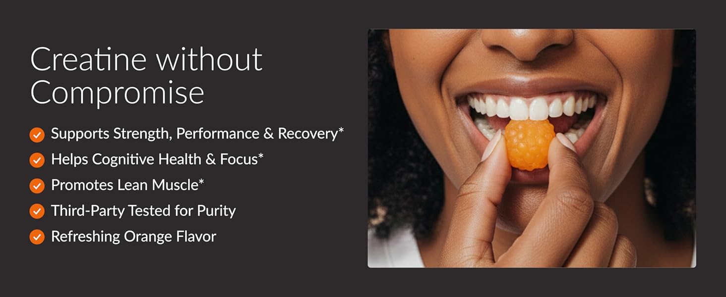 CONVENIENT ORANGE FLAVOR CREATINE GUMMIES – No mixing, no mess. These orange flavor creatine gummies make daily creatine intake easy at home, the gym, or on the go.