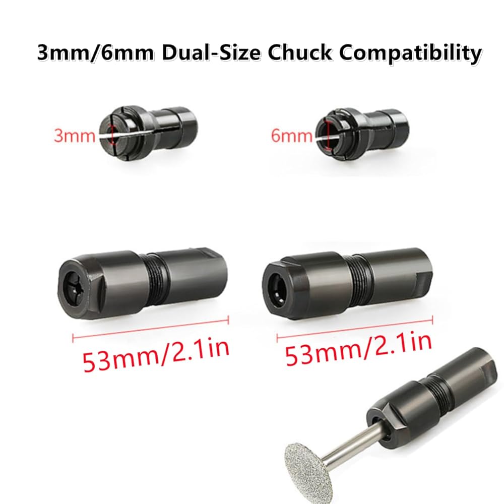3mm/6mm Dual-Size Chuck Compatibility: This precision drill bit connecting tool accepts 3mm and 6mm shank accessories, letting you swap cutting discs, sanding drums, or carving bits quickly for DIY or pro metal/wood projects