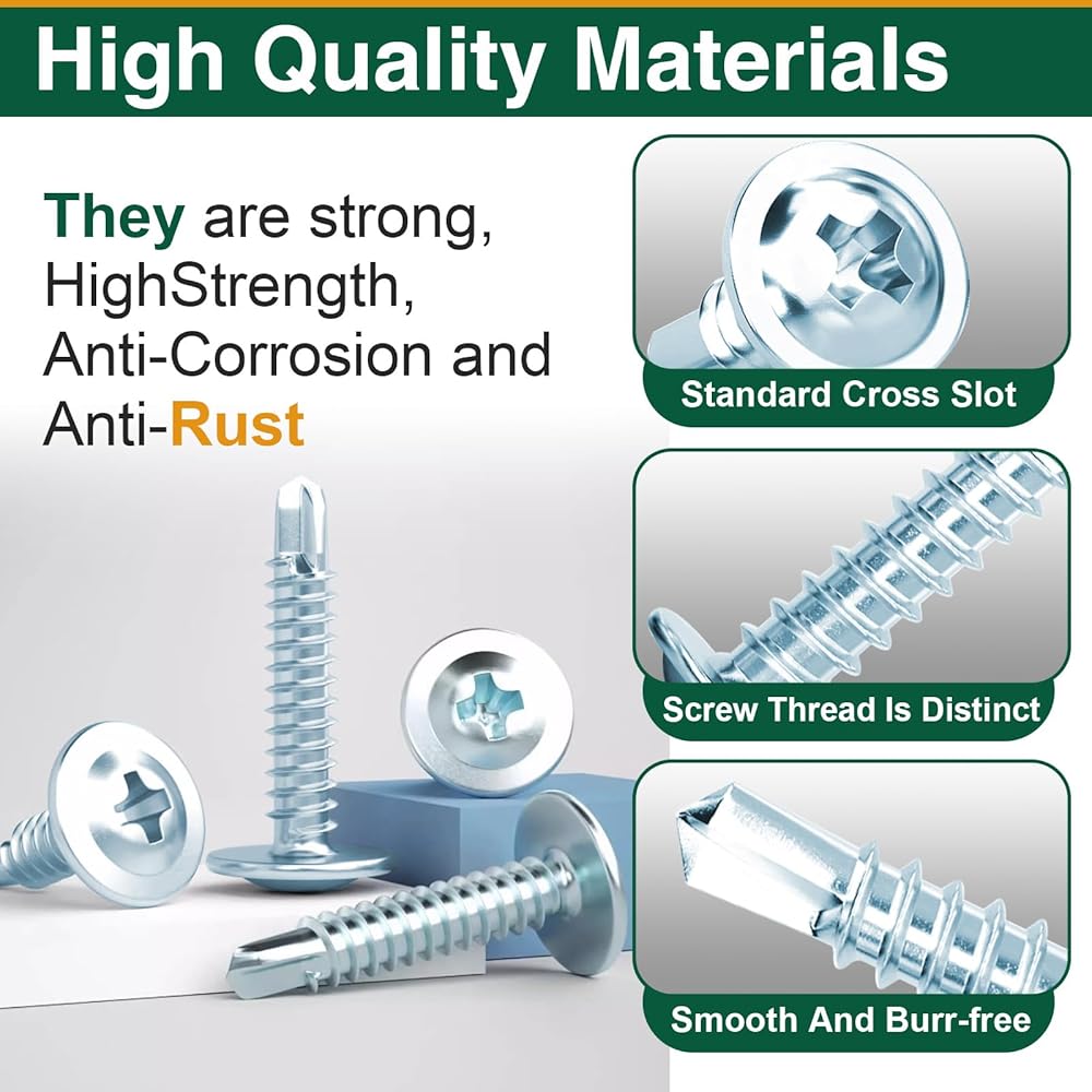 Quality Materials: For better performance, higher strength and long service life, we choose high-quality fresh carbon steel to make these metal screws self-tapping. With multi-layer galvanization, these self-drilling metal screws are resistant to rust or corrosion