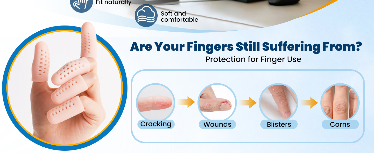 【SOFT & COMFORTABLE】Made from high-quality gel that feels like a natural extension of the skin of your fingers. These finger cots are ultra-soft and flexible to fit most finger sizes snugly without slipping, which can protect your fingers and relieve pain during any daily activities.