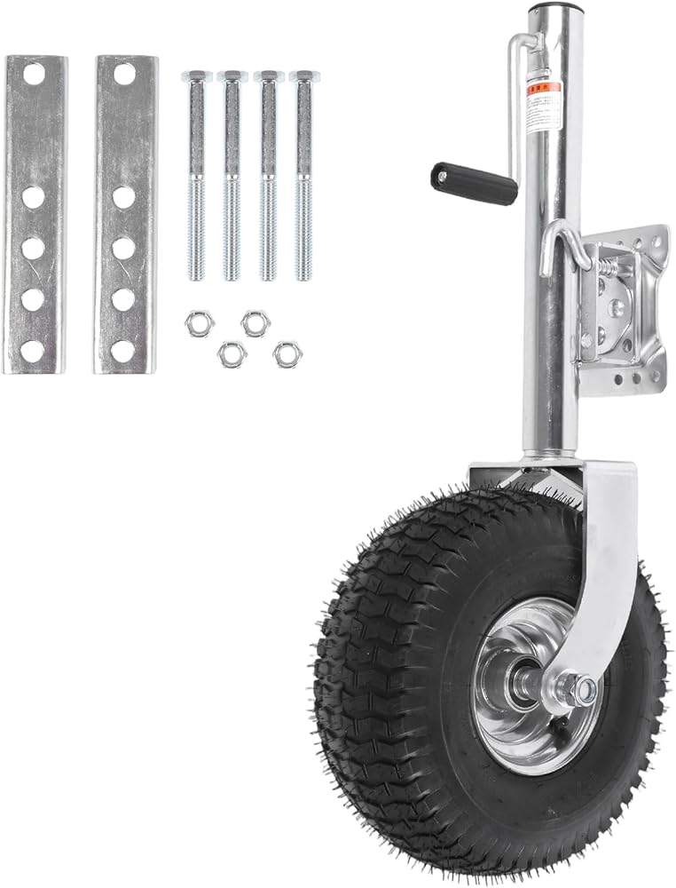 13.38" Wheel for Smooth Movement: Equipped with a sturdy 13.38-inch rubber coated wheel, this swivel tongue jack ensures easy and stable trailer movement on various grounds, ideal for beach and outdoor use.