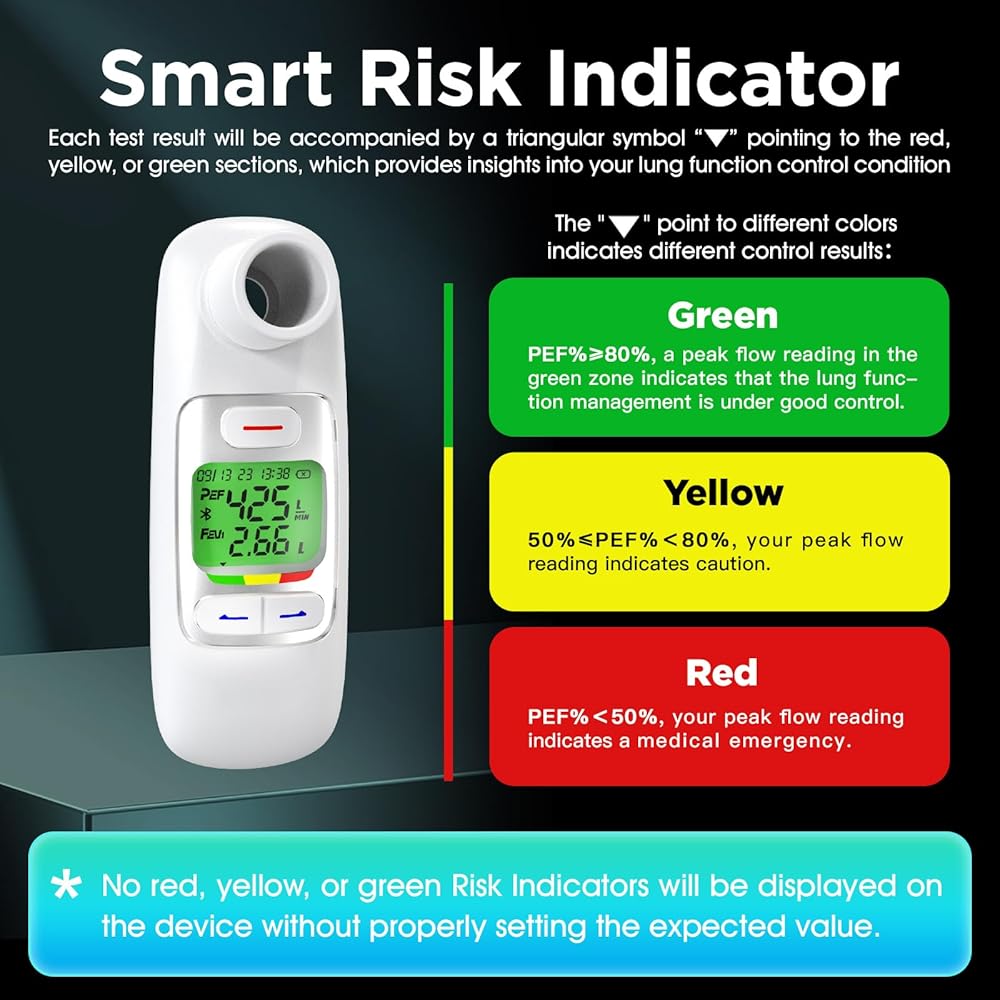 ● Risk Indicator & Customize Normal Expected Values: Sonmol Spirometer with large green backlit LCD screen which automatically displays test values, you can set up your personal expected value, and each test will show your lung function control condition with the risk indicator. We offer PEF expected value calculation tool. * No Risk Indicates will be displayed on the device without properly setting the expected value