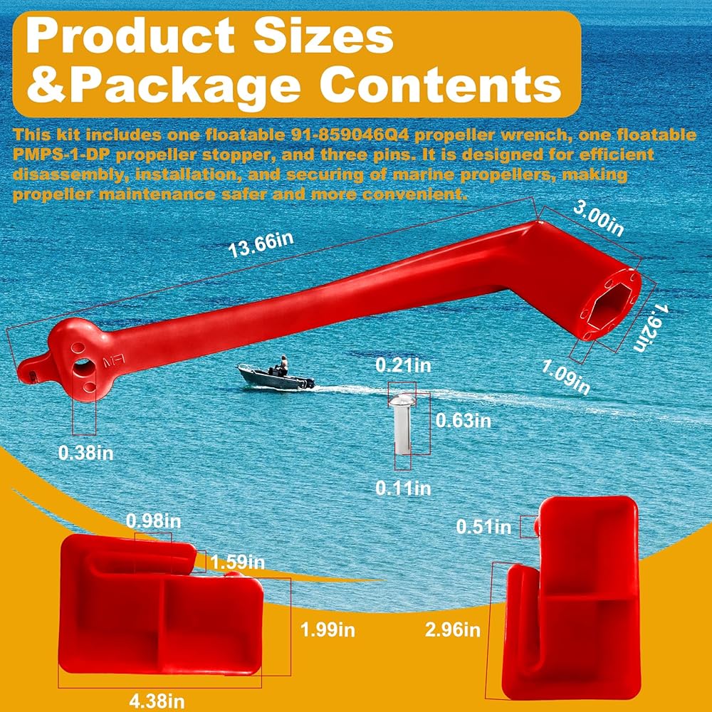 【Package Contents】This Marine Boat Prop kit includes a floating 1-1/16 inch Propeller Wrench (replaces 91-859046Q4) and a Prop Stop Block (replaces PMPS-1-DP). These two tools are used together to meet the needs of propeller installation, removal, and maintenance. Three pins are also included for prying out tab washers.