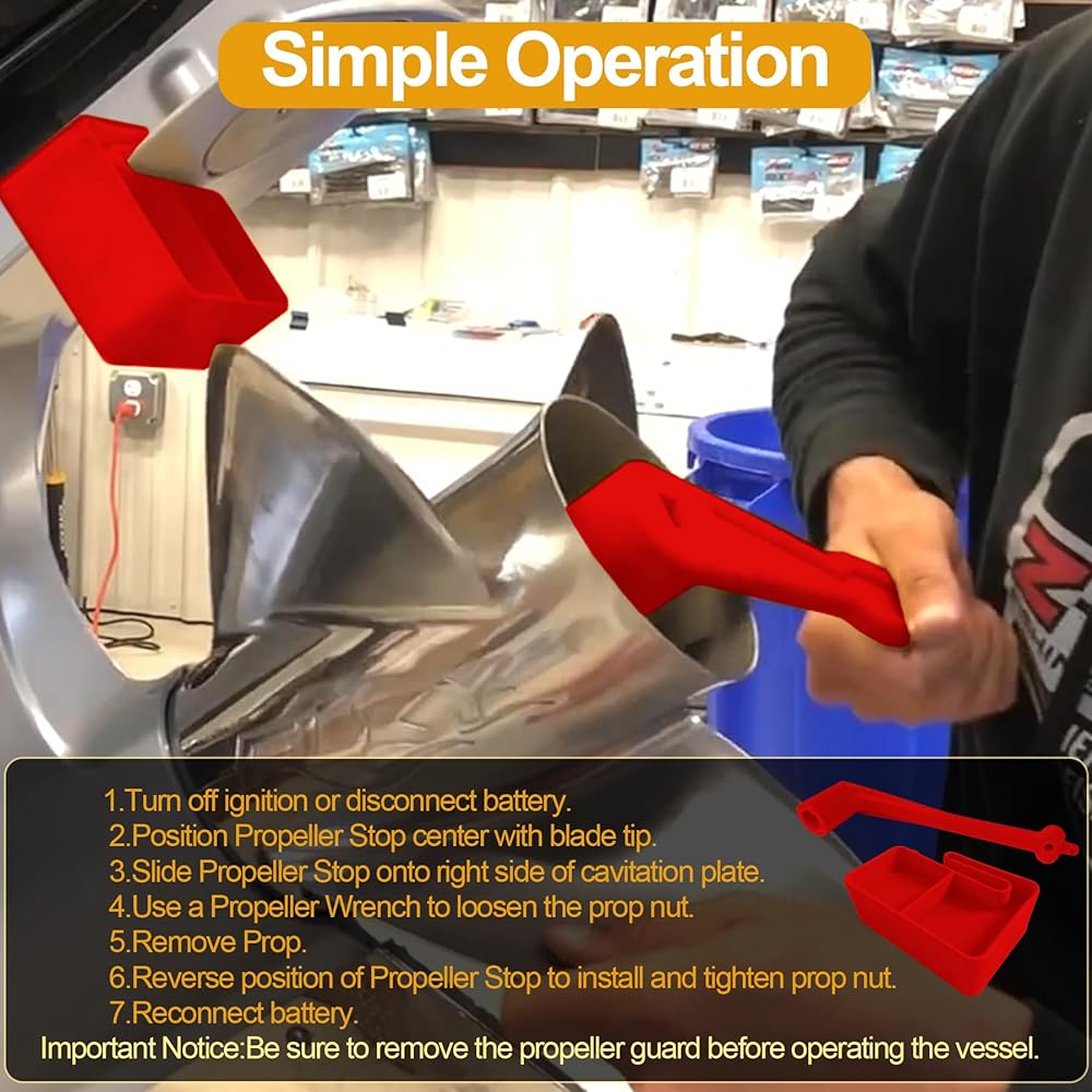 【Easy to Use】Simply slide the propeller stop block onto the anti-ventilation or cavitation plate to wedge one propeller blade and prevent it from rotating. Then, tighten the propeller nut with a propeller wrench to complete the installation. (Remember to remove the propeller stop block before using the vessel.)