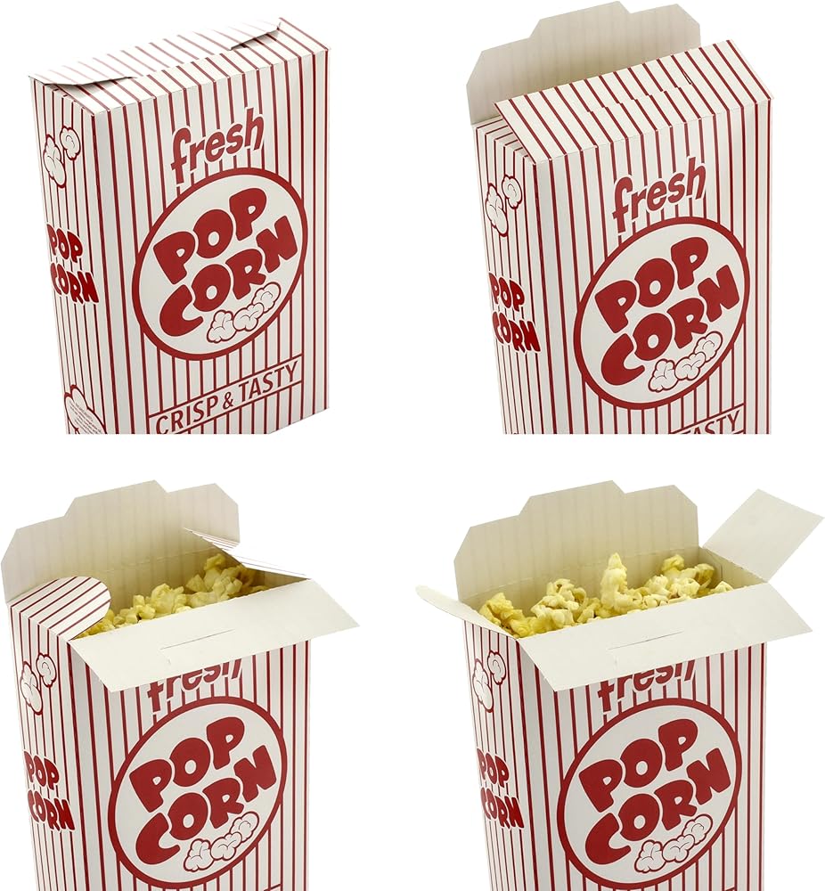Classic design; nostalgic red and white striped popcorn boxes bring the movie theater experience to your home or business and are perfect for celebrating any occasion