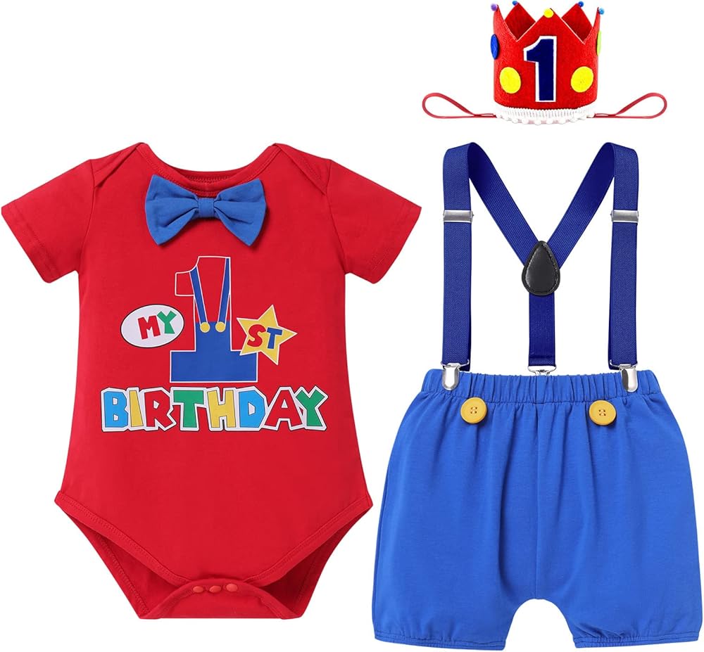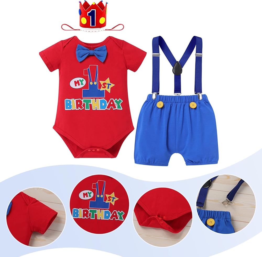 Baby Boy Sailing Circus Themd First Birthday Cake Smash Outfit Short Sleeve Romper Shorts Y-back Suspenders Crown Hat 4pcs Set Photo Shooting Props