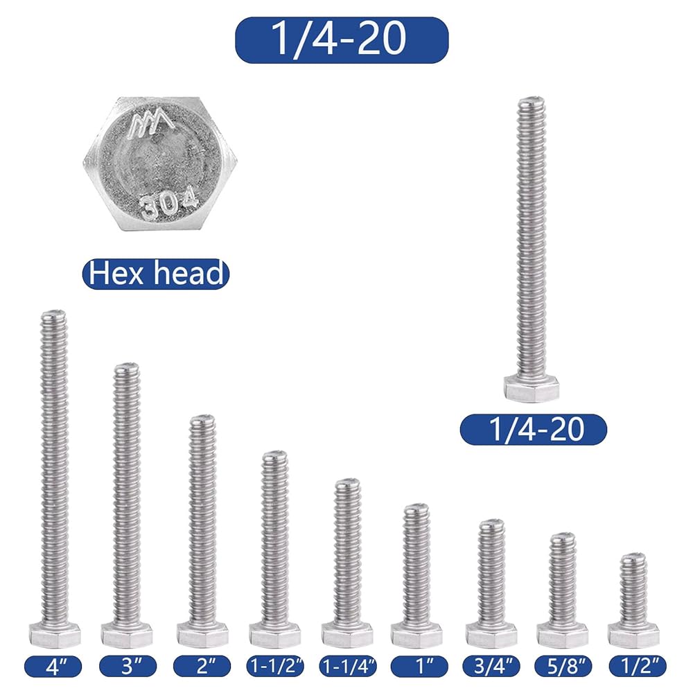 Hex Bolts and Nuts and Washers Kit:1/4-20 x1/2" bolts with Lock Nuts,Flat & Lock Washers Head Diameter,with bright finish,clean & smooth thread and no burrs,This Hexagon bolts makes your project look more professional which are favoured for heavy-duty fastening applications.