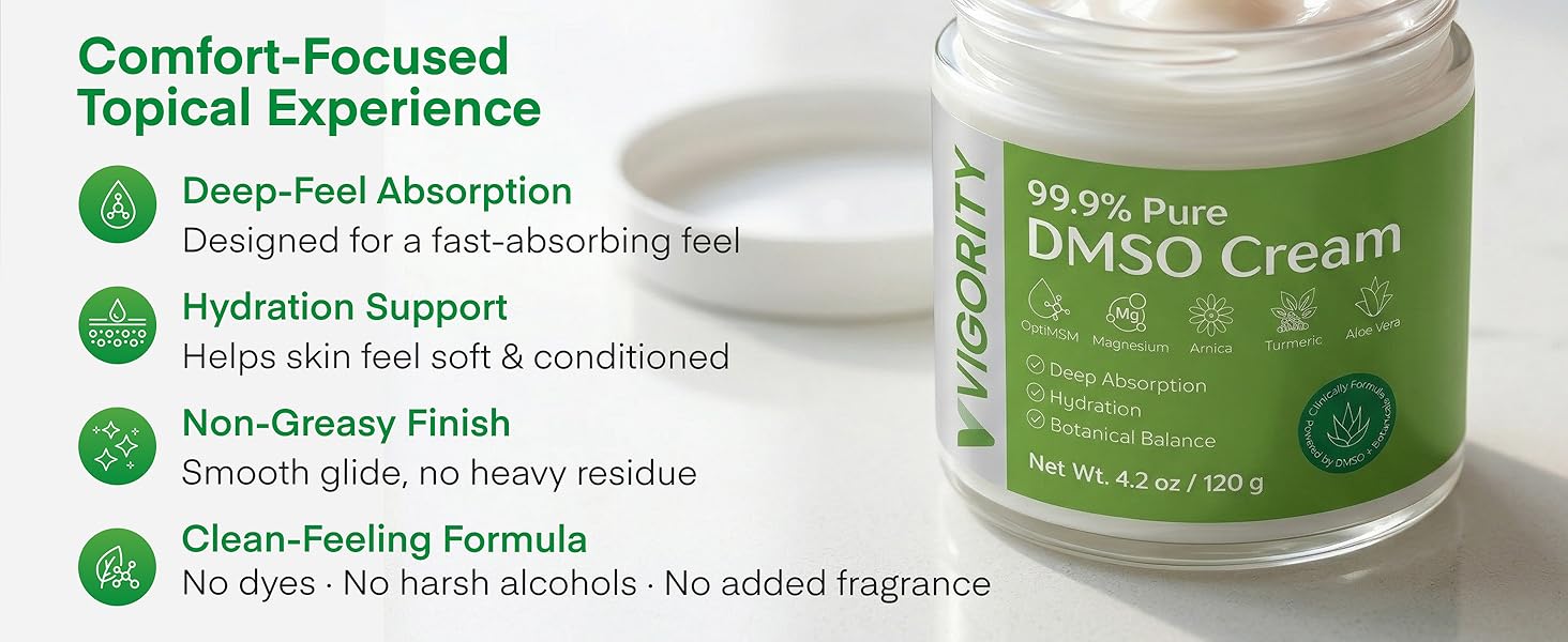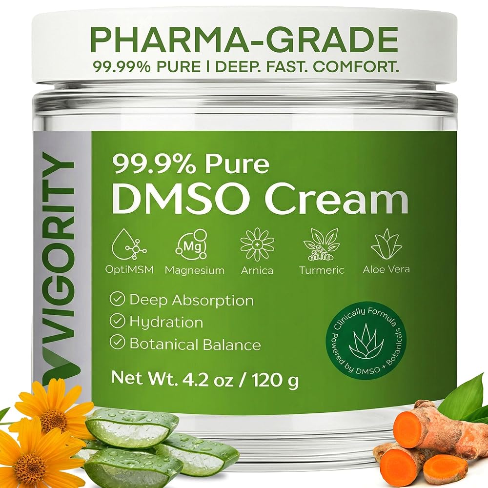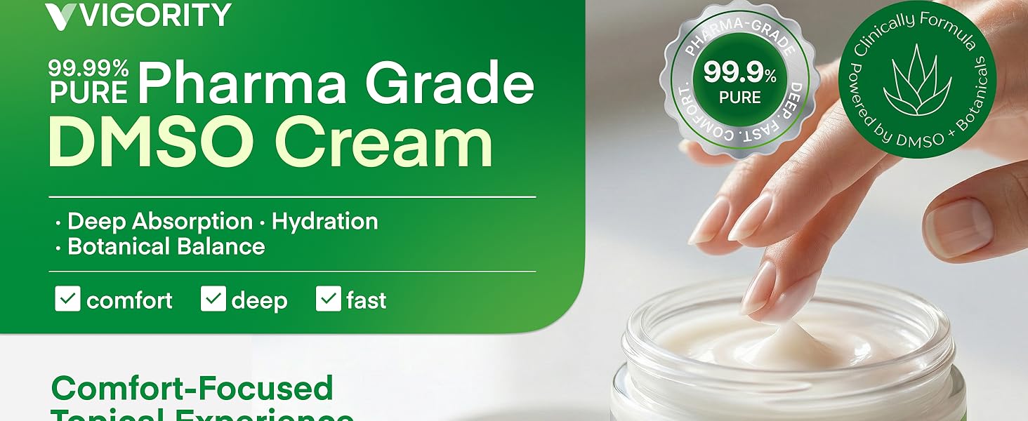 99.9% Pure DMSO Topical Cream Vigority 99.9% Pure DMSO Cream is a carefully crafted DMSO topical cream designed for daily skin care routines. This pharmaceutical grade DMSO cream inspired formula combines high-purity DMSO with aloe vera, OptiMSM, magnesium, and botanical extracts to support a balanced skin feel. Ideal for those looking for a medical grade DMSO style cream for topical use.