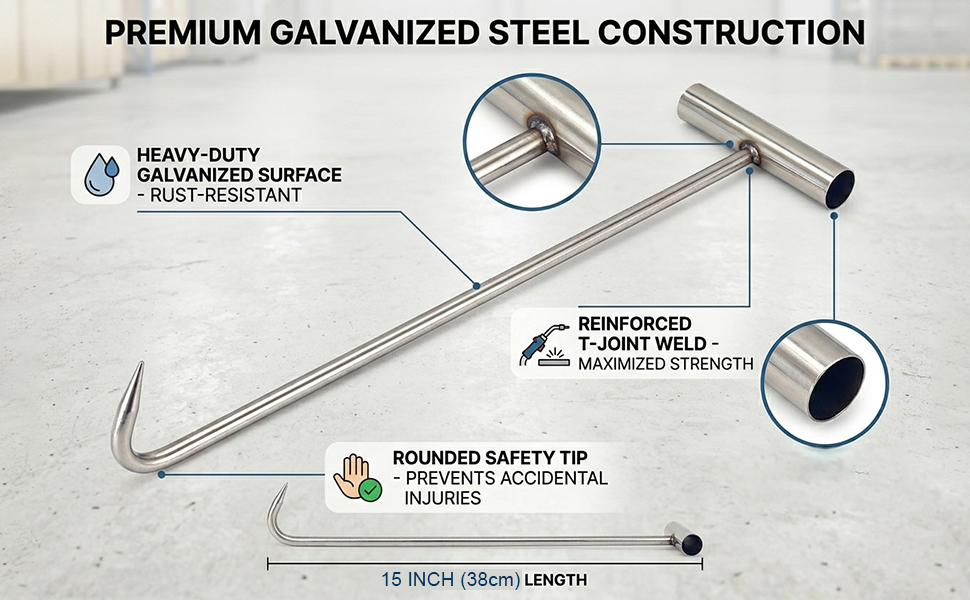 Heavy Duty 26'' (65cm) Long Manhole Hook T Hook Shape Lifting Reaching for Lifting Pulling Moving Manhole Covers, Storm Drains, Septic Tank Lids Door Pointed Head HOOK-PT-65