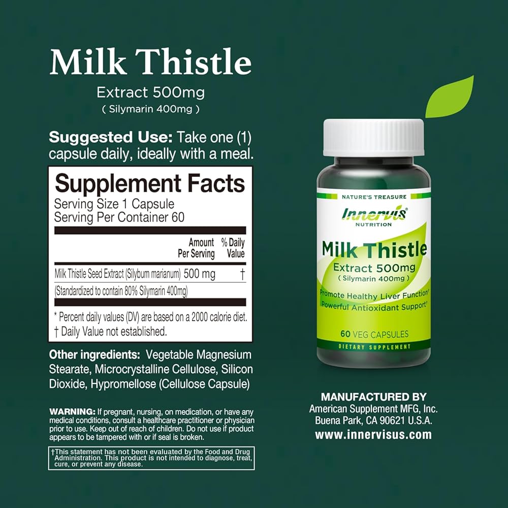 Innervis Nutrition High Potency Silymarin 400mg Milk Thistle Extract 500mg The Ultimate Support for Optimal Liver Function and Detoxification* Your liver works hard every day to filter toxins and keep your body running smoothly. Give it the concentrated support it deserves with Innervis Nutrition's Maximum Potency Milk Thistle formula. We ensure superior strength by standardizing our 500mg Milk Thistle Extract to yield an exceptional 400mg of pure Silymarin—the compound clinically researched for its profound hepatoprotective benefits.* Why Choose Innervis Nutrition's 400mg Silymarin Formula? High Bioavailability: Focusing on the standardized 80% Silymarin content ensures you get the most effective dose of the active ingredient with every single capsule.* Detox and Regeneration: Milk Thistle supports the natural regeneration of liver cells and aids the liver in its essential function of cleansing the body of metabolic waste and external pollutants.* Powerful Antioxidant Action: Combat oxidative stress with Silymarin's strong antioxidant properties, providing a protective barrier for crucial liver cells against free radical damage.* *These statements have not been evaluated by the Food and Drug Administration. This product is not intended to diagnose, treat, cure, or prevent any disease.