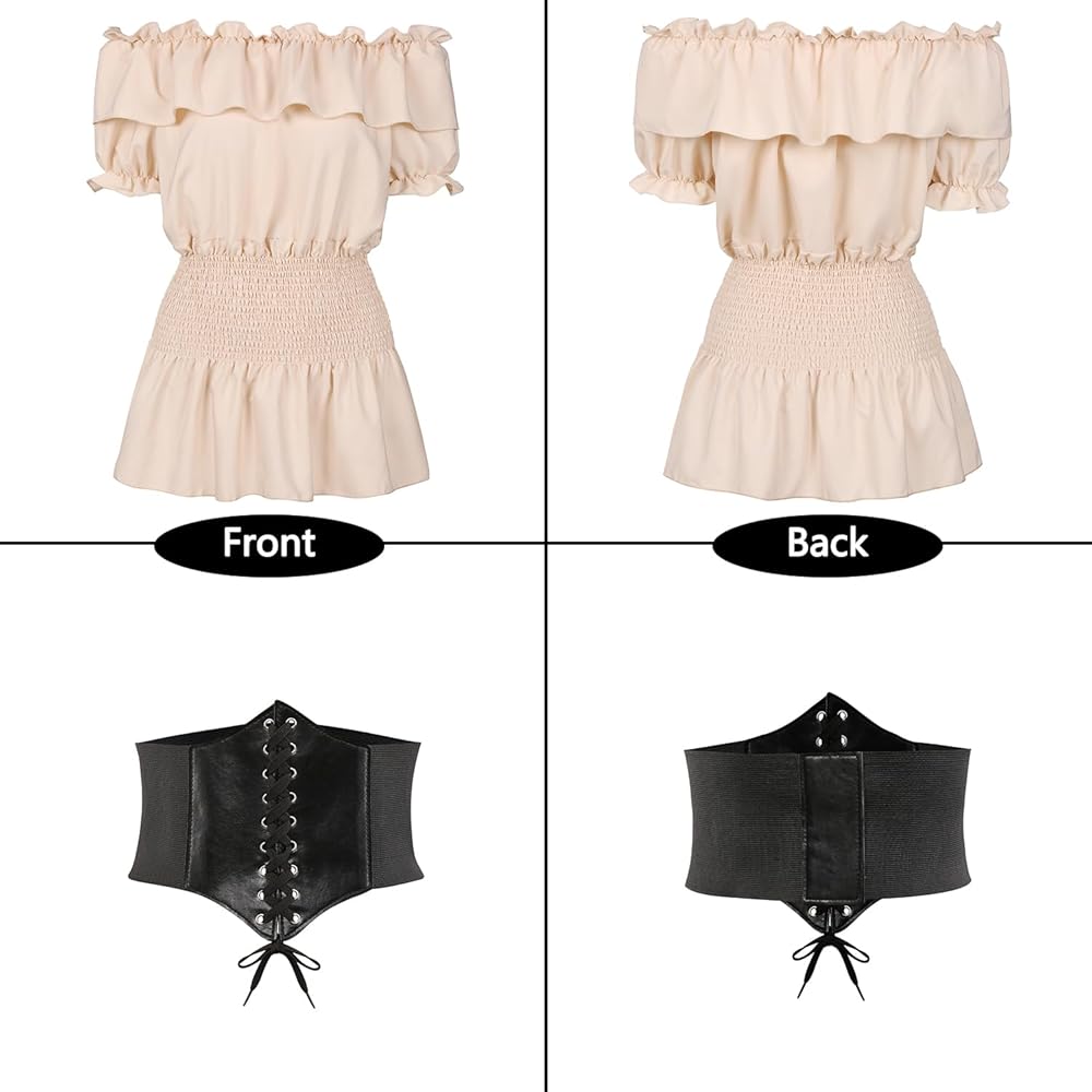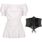 Complete Renaissance Steampunk Costume: Features Short Sleeve Off Shoulder Smocked Boho Shirt, Corset Waist Belt, and Wreath for an enchanting Renaissance look.