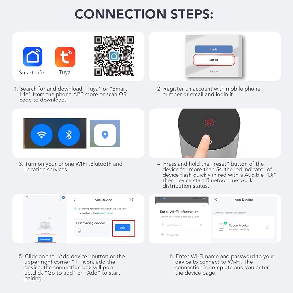 Mobile App Connection: Life Basis upgrated smart radon detector is connected to the mobile App, all results are delivered securely to your smartphone. Get hourly radon data and graphs anytime, anywhere with the App (iOS/Android), Wi-Fi connectivity required, not pair with a 5G Network/Router. Note: This device cannot be used with 5G WIFI, it can only be used with 2.4G WiFi connection
