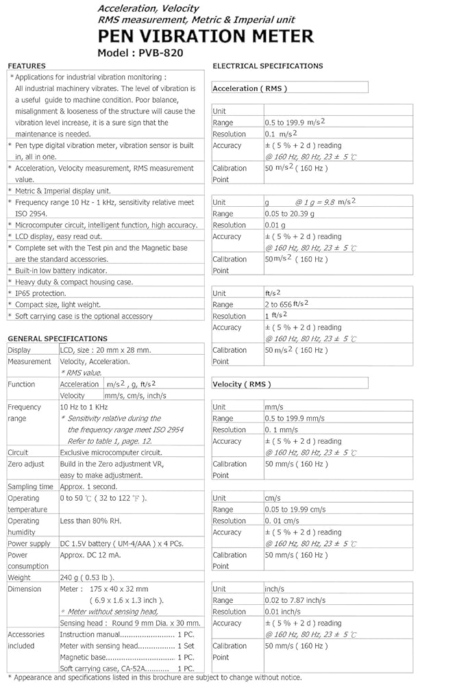 Supply Scope: 1 unit of PVB820, Instruction manual, Meter with sensing head, Magnetic base, Soft carrying case | Applications: All industrial machinery vibrates, etc.