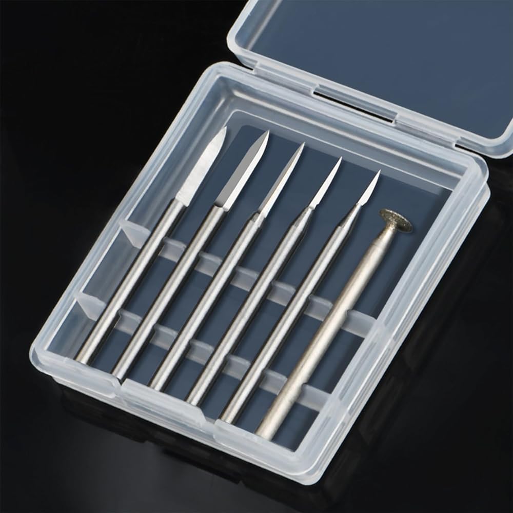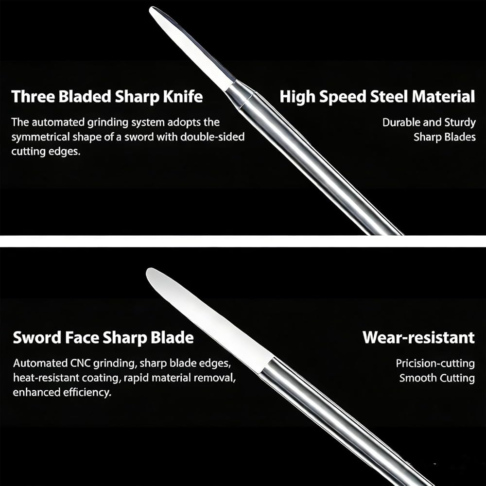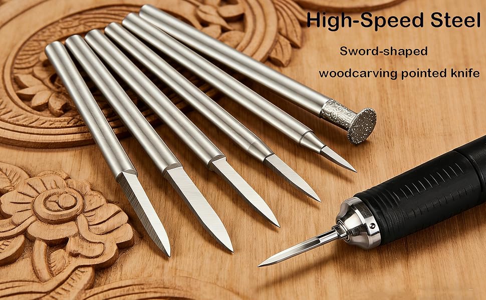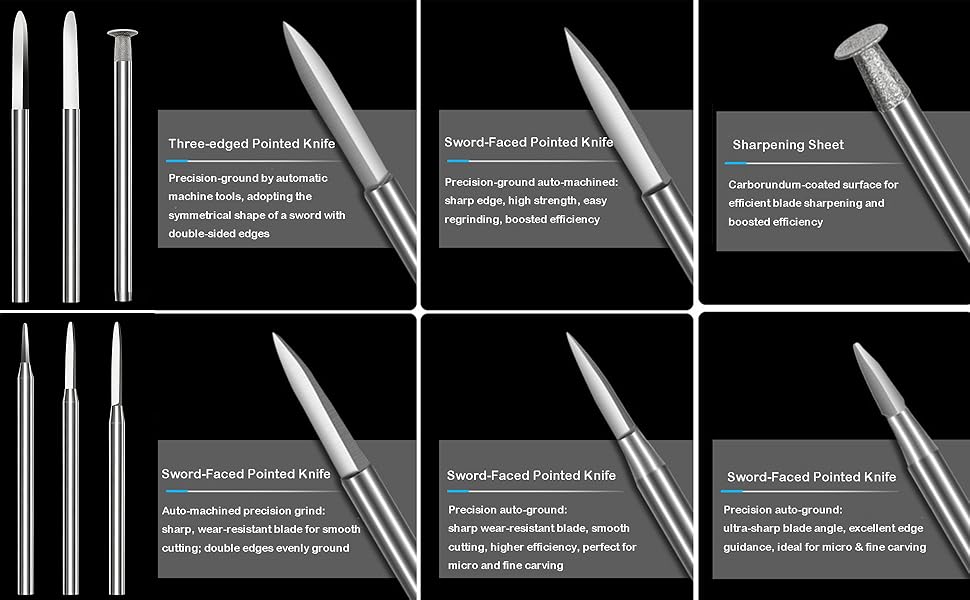 【Practical Functional Design】The set features a sword-pointed knife design, which easily reaches narrow, hard-to-access areas—ideal for wood line drawing, outlining, nuclear carving, lettering, and roughing work. It also includes a three-blade pointed carving bit (for carving, sculpting, polishing, drilling) and a diamond grinding head. The diamond head quickly sharpens dull blades, effectively extending the bits' service life.