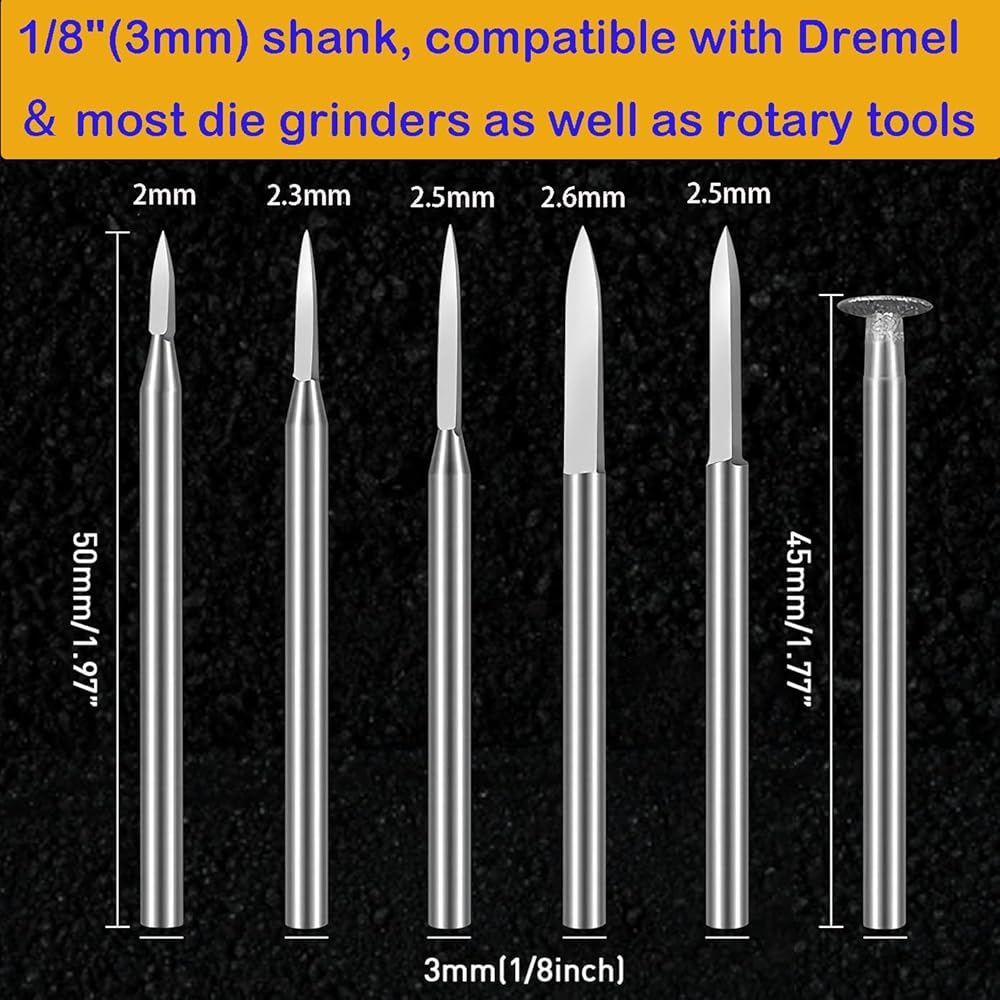【Hassle-Free Installation & Wide Compatibility】Installing these 6 engraving drill bits is a breeze. The 3mm (1/8”) shank fits Dremel rotary tools, plus most other rotary tools, drills, and mold grinders. Bits are simple to replace, with strong durability and wear resistance. Their broad compatibility lets you carve wood safely and efficiently, significantly boosting your work productivity.