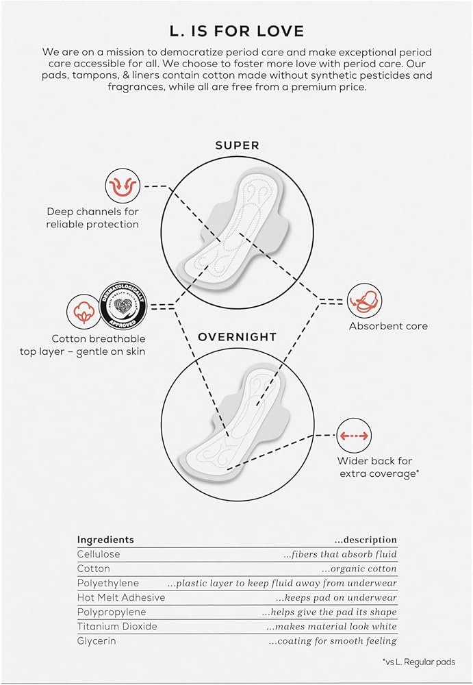 At L, we believe that period care should be both gentle on skin and powerful. Our mission is to provide exceptional protection you can trust. Our pads, tampons, and liners are made without synthetic pesticides and fragrances and crafted with a powerful leak-stopping design. We prioritize using only high-quality ingredients, including an organic cotton core in our tampons and an organic cotton top layer on our pads and liners. Experience the perfect balance of gentle and powerful protection with L., because you deserve nothing less. L. is for Loving Your Self: Our tampons contain a US grown organic cotton core, are made without synthetic pesticides and fragrances, and have applicators made without BPA. Also, our pads and liners are made with a US grown cotton top layer and are made without synthetic pesticides and fragrances. L. is for Lending A Hand: We see access to period care as fundamental for every body and an opportunity for change. We are on a mission to make exceptional period care accessible for all. Thats why we provide funding every year to non-profit, community-based organizations around the world that increase access to period care and menstrual health education. SAFETY STARTS WITH SCIENCE: Protection begins with safety. That's why at L. we have engineers, chemists, biologists, and safety scientists who evaluate every ingredient throughout the discovery, design, and development of our products. Ingredient safety is our top priority, so we are continuously studying new scientific research, reviewing consumer feedback, and connecting with experts, to ensure every product performs at its highest and safest level. QUALITY IS OUR OBSESSION: For us, creating a product you trust is more than just combining great ingredients – it's working with other companies that care about quality and safety as much as we do. We work hard to find the right partners and suppliers worldwide with ingredients that meet our standards. We draw from our resources to follow industry-leading testing methods on our ingredients and screen for background substances. We rely on proof and data when selecting our ingredients, but also for setting standards on how our products are made.