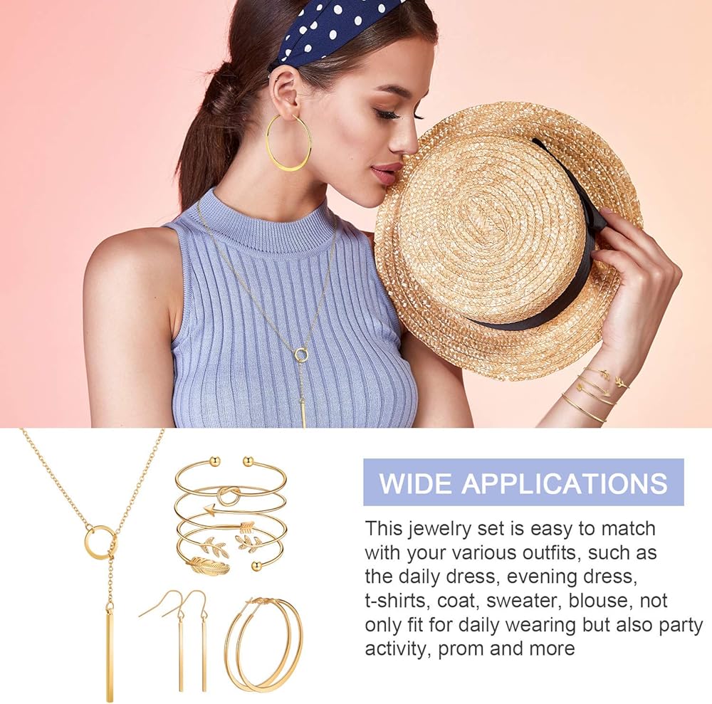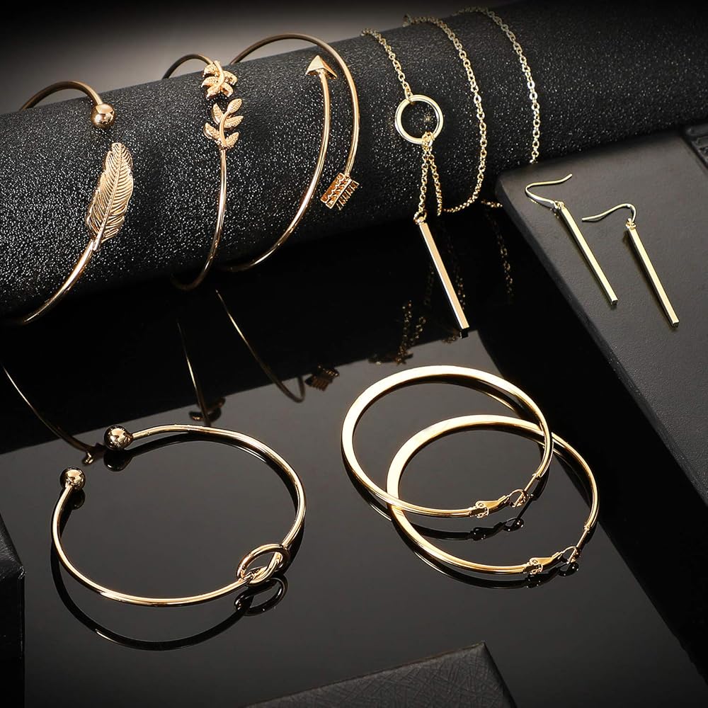 The bracelets have 4 different dainty designs, arrow, olive leaf, feather and knot heart, the necklace fixed the bar into the circle, also combined with square geometric stick drop earrings or hoop earrings, simple design but not out of date easily, with classic color matching, elegant and delicate.