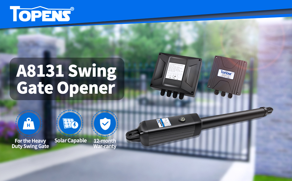 【Choose TOPENS】 Over 25 years of specialized experience in gate automation industry. We aim to deliver safe, smart & reliable gate operator systems with long-lasting performance. With a built-in STABLE DC 24V 80W motor, A8131 automatic gate opener easily drives the heavy-duty single swing gate up to max 880lbs. in weight OR max 18ft. in length. The ultra-quiet electric gate motor will automatically open and close your gate, and bring your family an easier and more comfortable life.