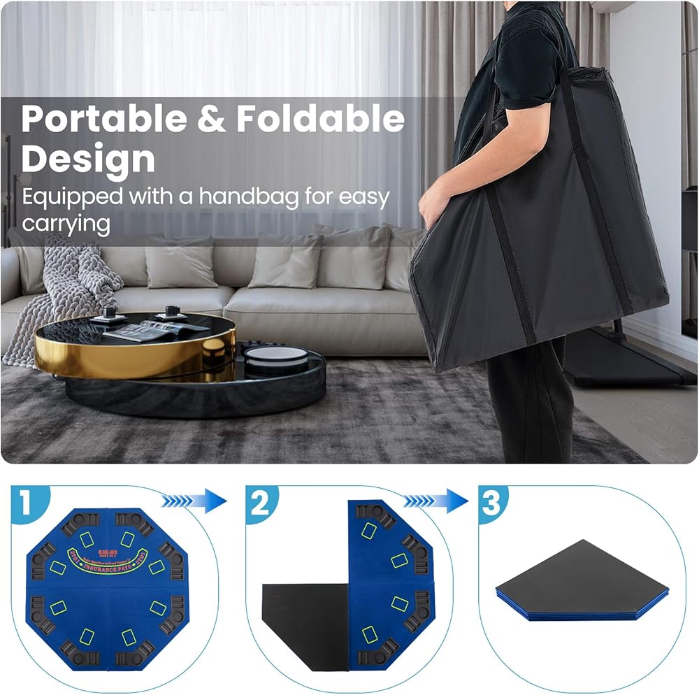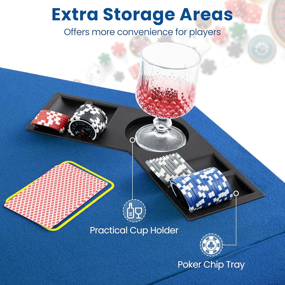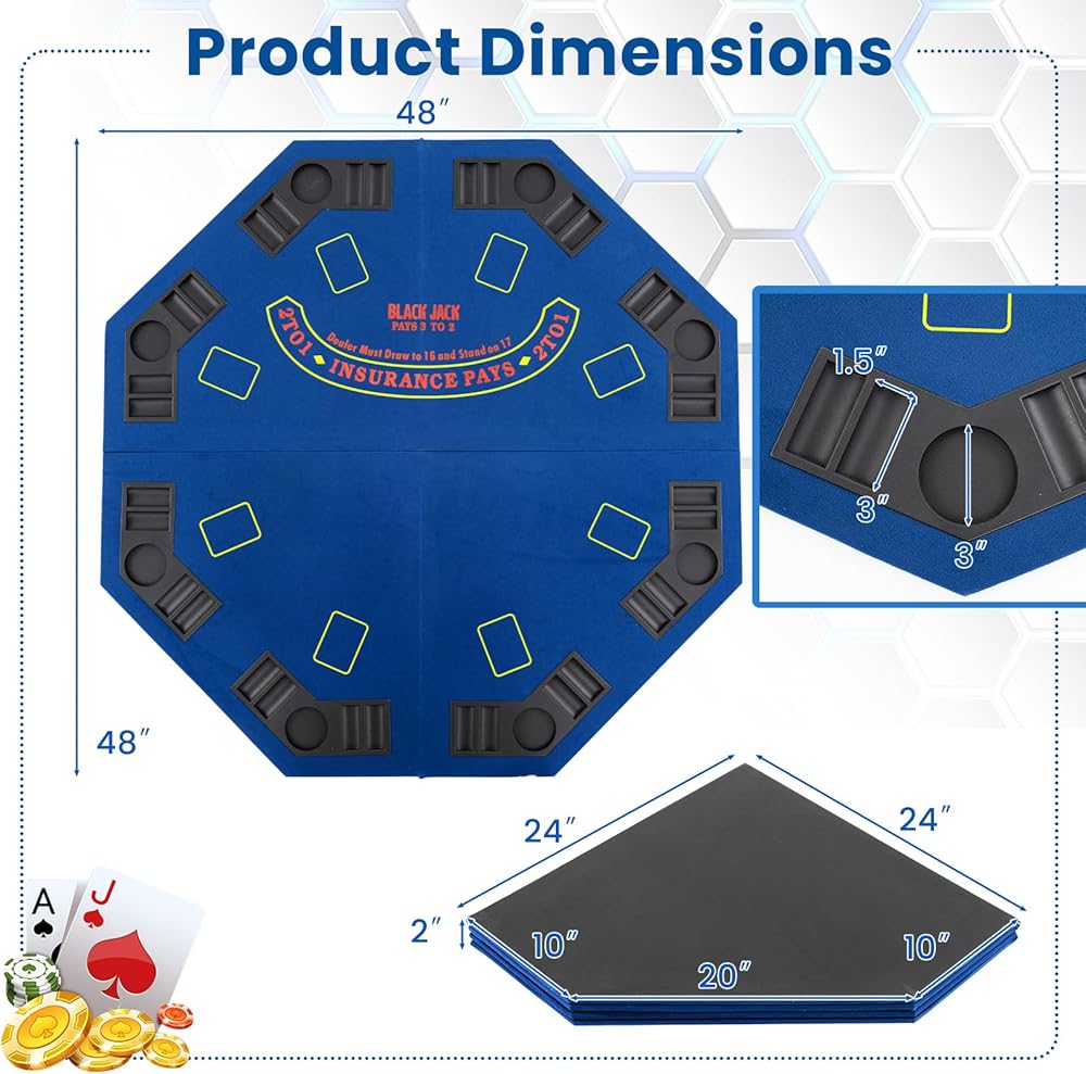 Our 8-player poker table top, measuring 48” x 48” (L x W), is designed to comfortably accommodate up to 8 players, making it perfect for poker, Texas Hold'em, Blackjack, Bridge, or Five Card Stud. It features a quad-fold mechanism, which allows for easy storage and transportation with the included handbag. Besides, the table top also offers extra storage with 8 cup holders and 4 poker chip trays for each, ensuring your drinks and chips are neatly organized and within reach. Crafted with a casino-grade green felt surface and a premium MDF frame, it provides smooth card sliding and excellent durability. This poker table top brings the classic casino ambiance to any setting, ideal for various scenarios, from family game nights to outdoor picnic parties.