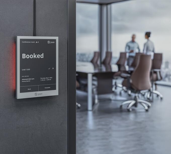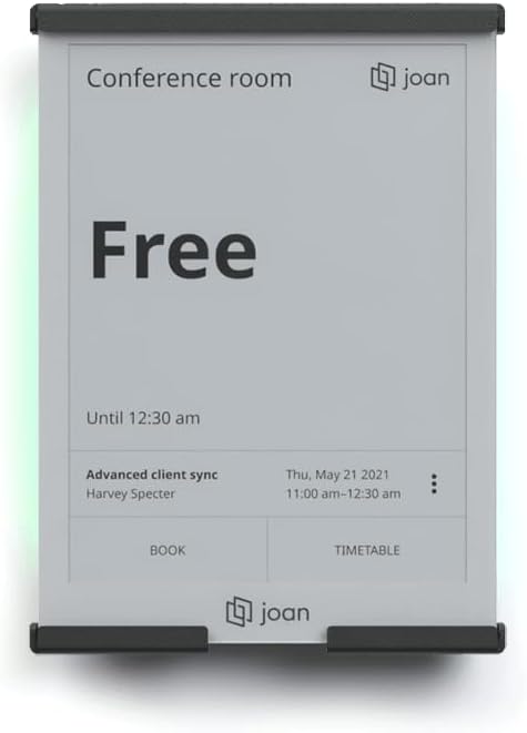 Fully-wired optional Power over Ethernet dock, designed exclusively for Joan 6 Pro, provides constant power and ethernet communication instead of WiFi. It additionally displays room occupancy status – green for free, red for booked, and orange for the upcoming meeting.