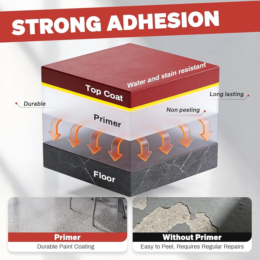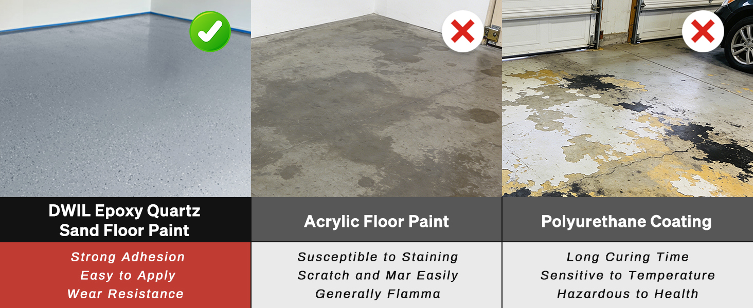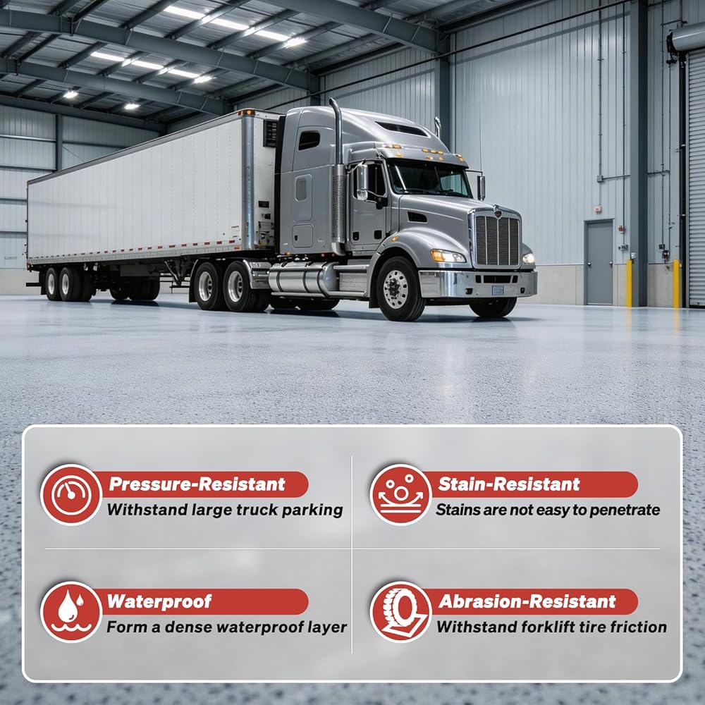 【Industrial-Grade Toughness】Our epoxy sand floor paint boasts a 10H hardness rating, offering superior resistance against forklifts and trucks. The advanced hardening agents create a densely compacted surface layer that actively repels chemical corrosion, stubborn stains, and daily wear while maintaining brilliant, anti-yellowing, fade-resistant gloss for years. Included primer enhances adhesion to substrates, preventing delamination and significantly extending the floor's service life.