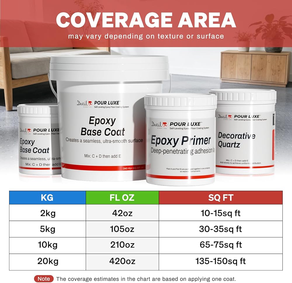 【Versatile Coverage】Each 2kg bucket of epoxy colored sand paint covers 10–15 sq.ft., offering versatile application across concrete, tiles, wooden floors, and terrazzo, perfect for virtually any space: from living rooms and bedrooms to bathrooms, hotels, showrooms, workshops, and outdoor patios. Whether you're updating a residential space or upgrading a commercial area, this coating provides a high-quality finish that meets the demands of both indoor and outdoor environments.