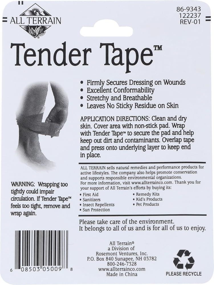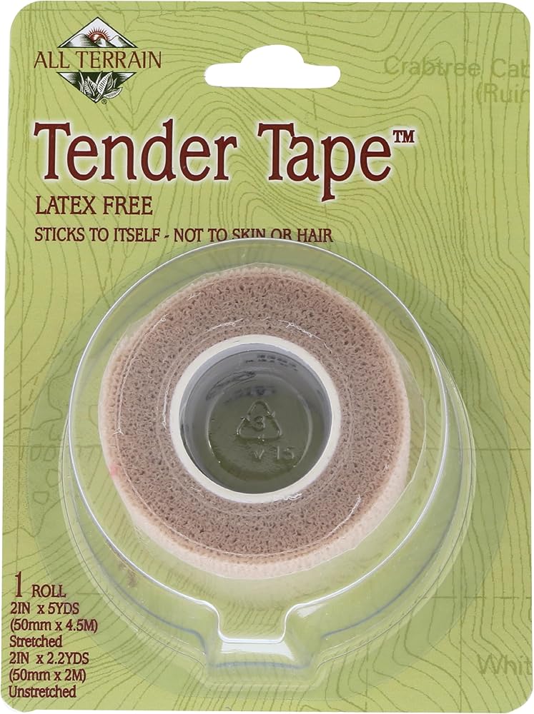 All terrain tender tape allows you to firmly secure your wounds without having to worry about it sticking to the skin or the hair on the skin. That's because it sticks to itself and not your skin. The latex-free tape is designed to give you excellent comfort when applied. All terrain tender tape does not leave a sticky residue on your skin either. You just loosely wrap the tape around your wound to begin to heal. This 2-inch wide roll is 5 yards long, which is plenty for extended use.