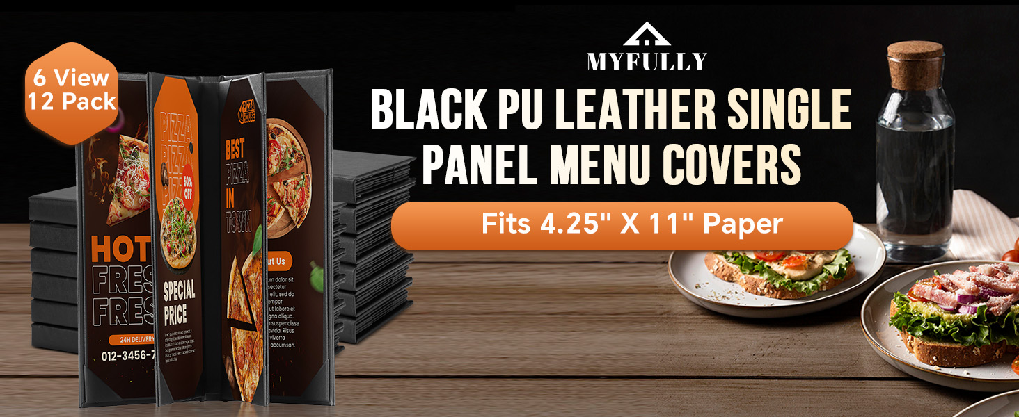 MYFULLY Restaurant Menu Holders 4.25" x 11", 12 Pack Black PU Leather Single Panel Menu Covers with Angled Corners for Restaurant, Bar, Coffee Shop, Wine List (6 View)