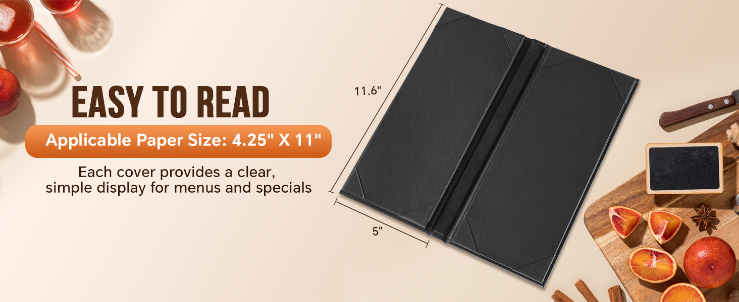 Clear Display: Menu cover size: 5" x 11.6", Applicable paper size: 4.25" X 11". Each menu cover offers a clean, uncluttered presentation for drink menus, wine lists, or daily specials. Perfect for restaurants, cafés, bars, and hotels.