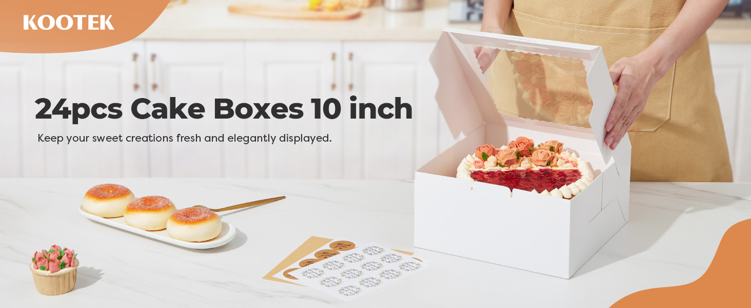 24 Packs: Comes with 10-inch cake boxes a total of 24, and 72 stickers. The bakery box with a window can be used for the placement of small cakes, pies, sweets, baked goods, etc. 2 versions of stickers plus 1 blank style sticker for a total of 72 stickers. Adding these stickers directly to the gift box to better show your love.