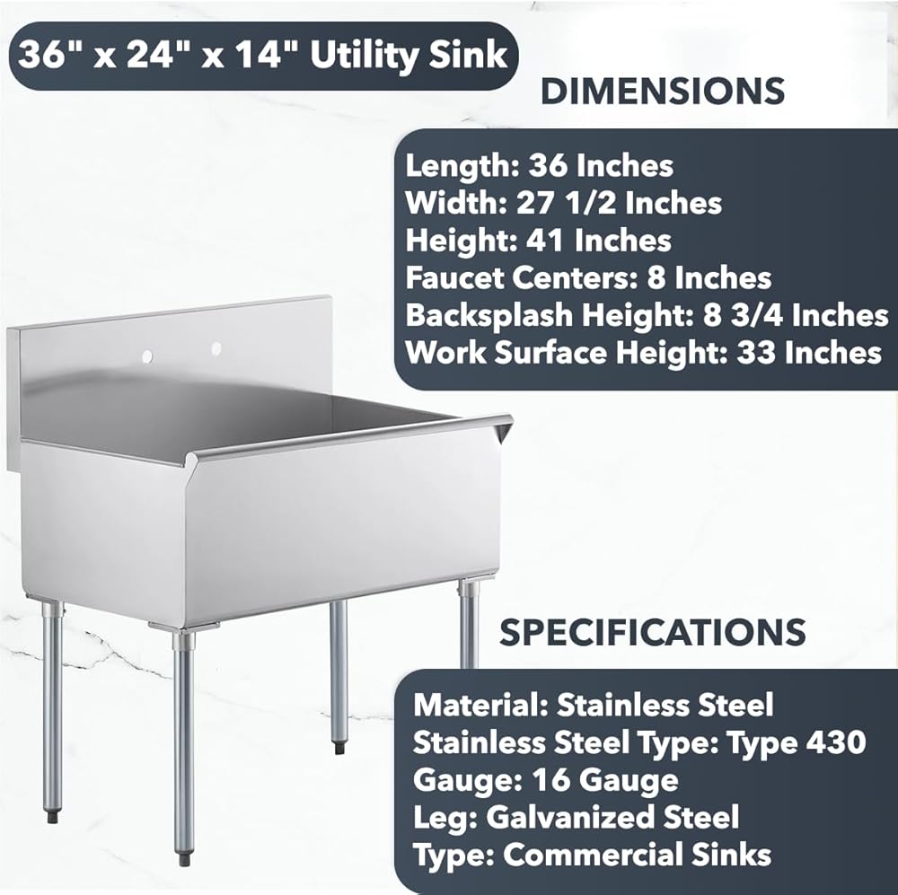 These commercial freestanding utility sinks are available in 16-gauge Type 304 or Type 430 stainless steel to suit different environments and budgets. Each sink features a deep bowl, an 8 3/4" backsplash, galvanized steel legs with adjustable feet, and a complete drain assembly for dependable daily use.