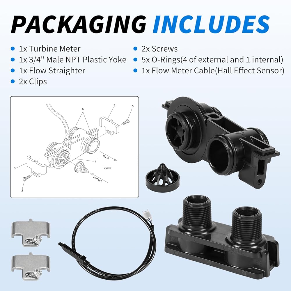 【Package Includes】1x Turbine Meter Assembly; 1x 3/4" Male NPT Plastic Yoke; 1x Flow Straighter; 2x Clips; 2x Screws; 5x O-Rings(4 of external and 1 internal); 1x Flow Meter Cable(Hall Effect Sensor)
