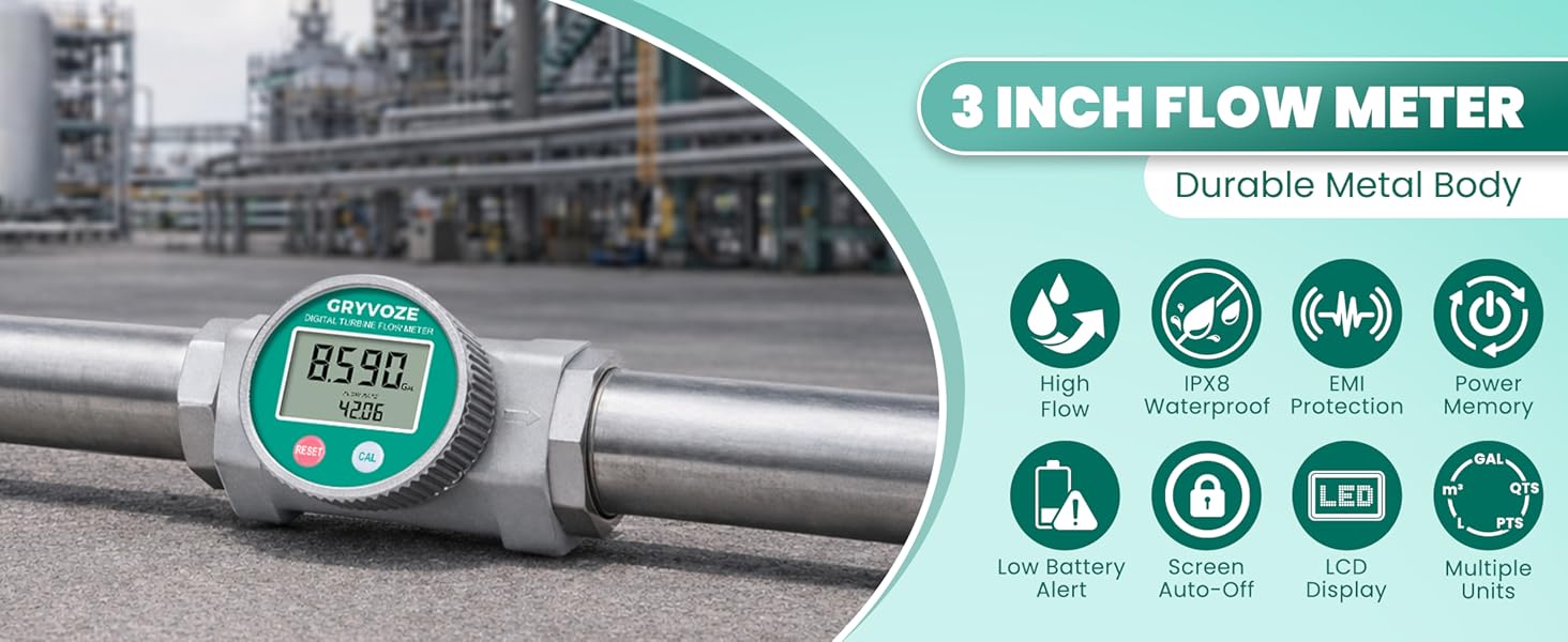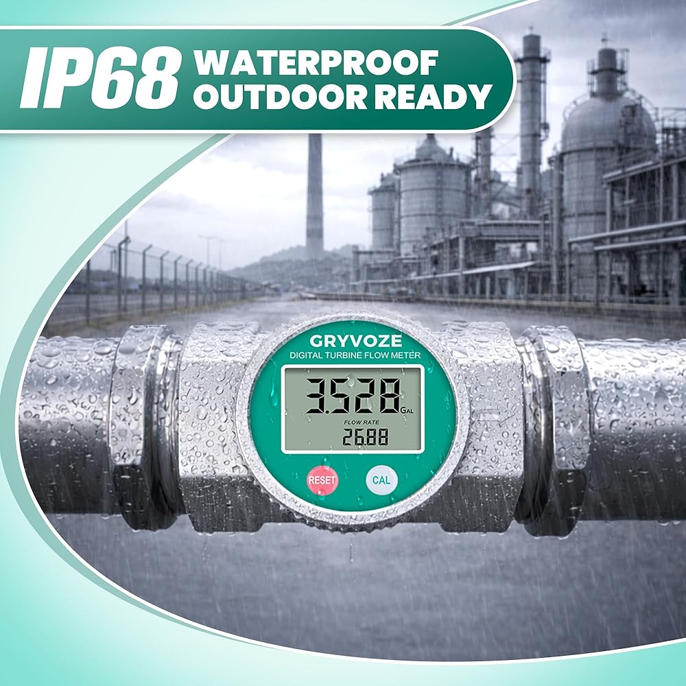 IP68 Waterproof: This 3 inch flow meter features a durable, rust-resistant aluminum housing that protects the meter from rain, splashes, and wet outdoor conditions.
