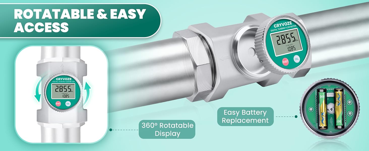360° Rotatable Panel: The 3" flow meter display panel rotates 360° for easier viewing after installation. The battery can be replaced without removing the meter from the pipeline.