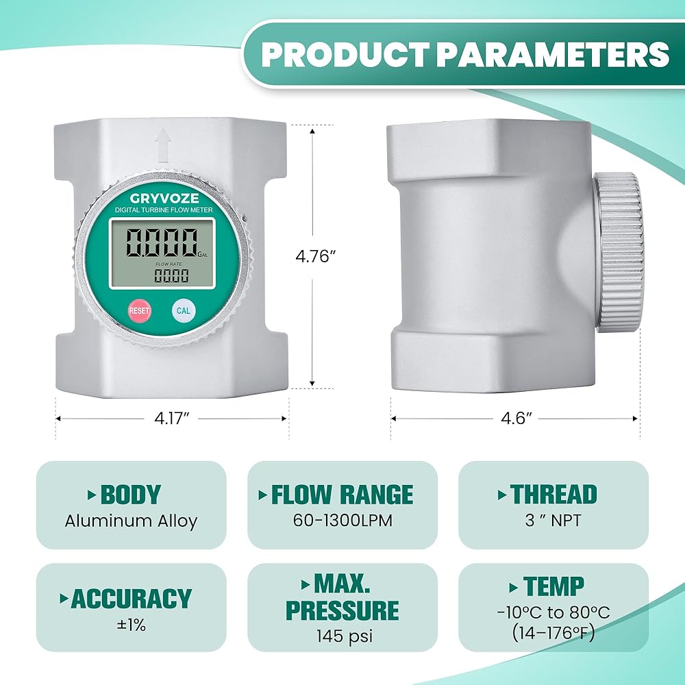 Accurate Measurement: This 3 inch digital flow meter offers measurement accuracy up to ±1%, a flow range of 16-343 GPM, a working temperature of -10°C to +80°C (14°F to 176°F), and a maximum working pressure of 145 PSI.
