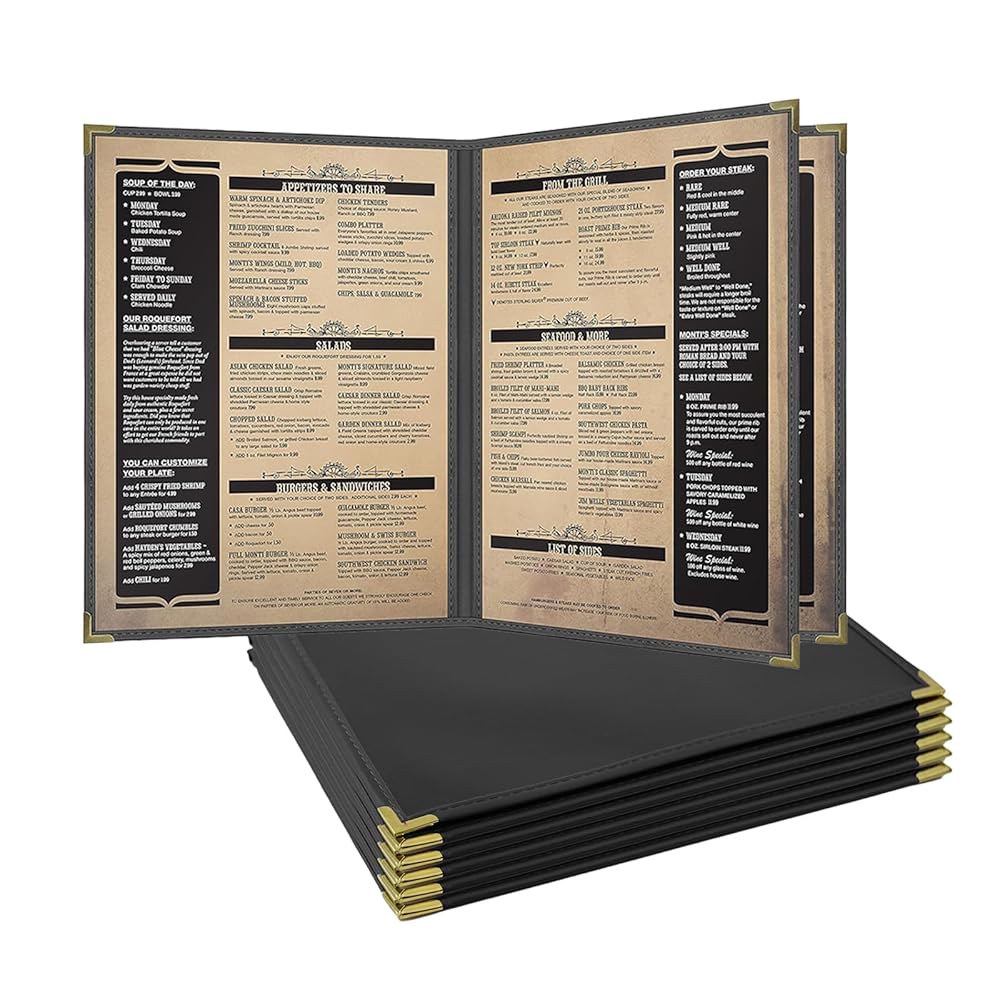 ✔Elegant Design: Features a sleek black leatherette trim with gold decorative corners, offering a sophisticated and upscale presentation for your restaurant, cafe, or bistro.