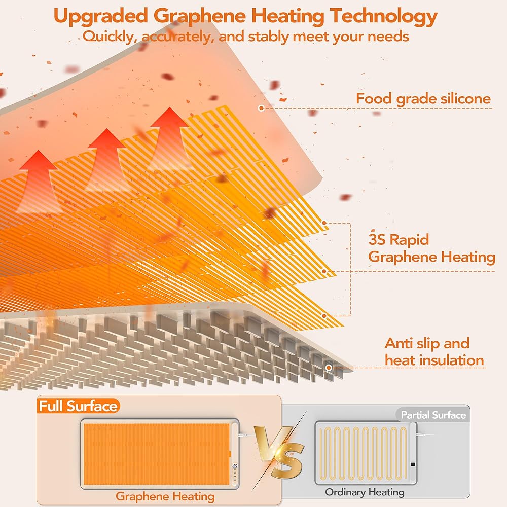 Graphene Full Surface Heating - Upgraded Graphene Heating Compared to ordinary resistance heating, graphene heating can directly penetrate deep into objects for heating, with a thermal conversion rate of up to 99% and energy consumption 30% less than resistance heating. Graphene can quickly heat up within 3 seconds and reach the set temperature accurately within a few minutes, with a temperature difference of less than 1 ° F. In addition, it has no risk of oxidation and leakage, and has a lifespan of up to 50 years.