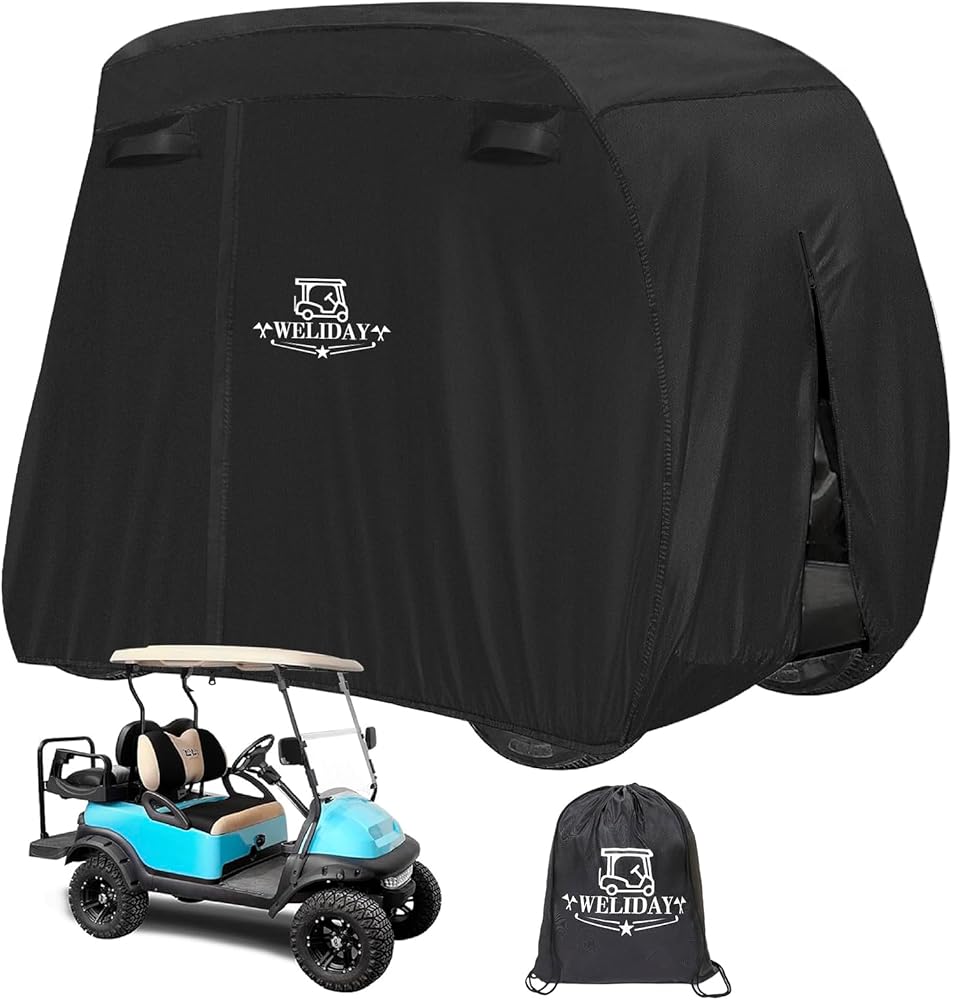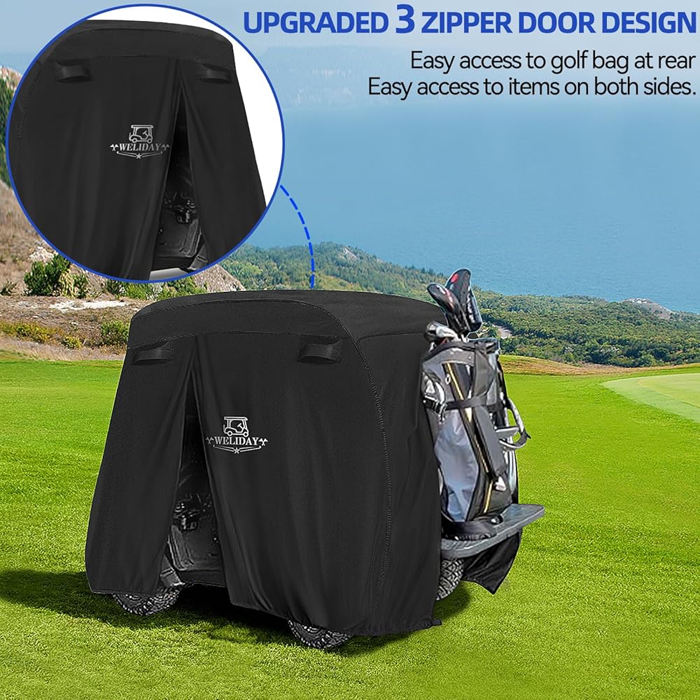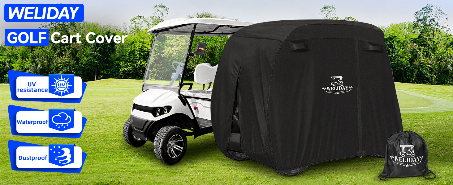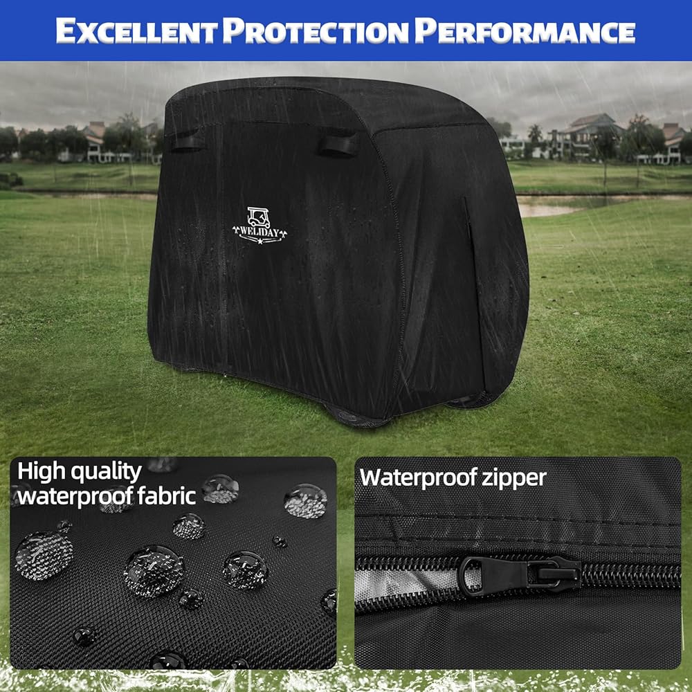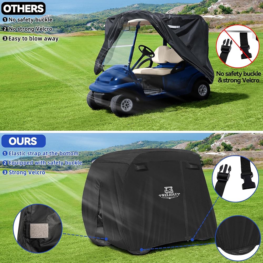 【High-quality Fabric】WELIDAY golf cart cover is made of water-resistant and splash-proof 400D silver-coated fabric. The windproof straps at the bottom and the elastic hem keep the cover firmly in place, even in strong winds
