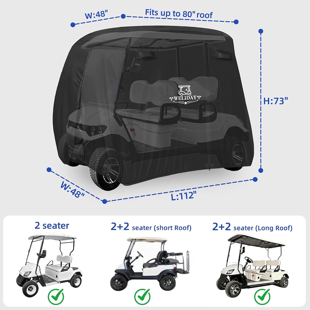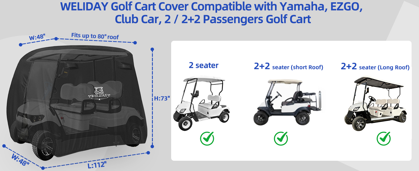 【Customized Size】With a size of 112 inches long x 48 inches wide x 73 inches high, this cover fits most 2/ 4-person golf carts and is compatible with well-known brands such as Yamaha, Club Car and EZGO