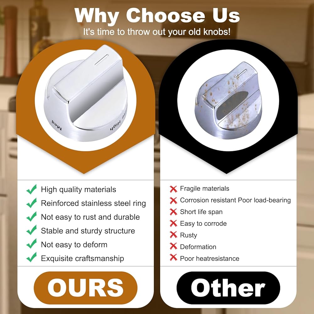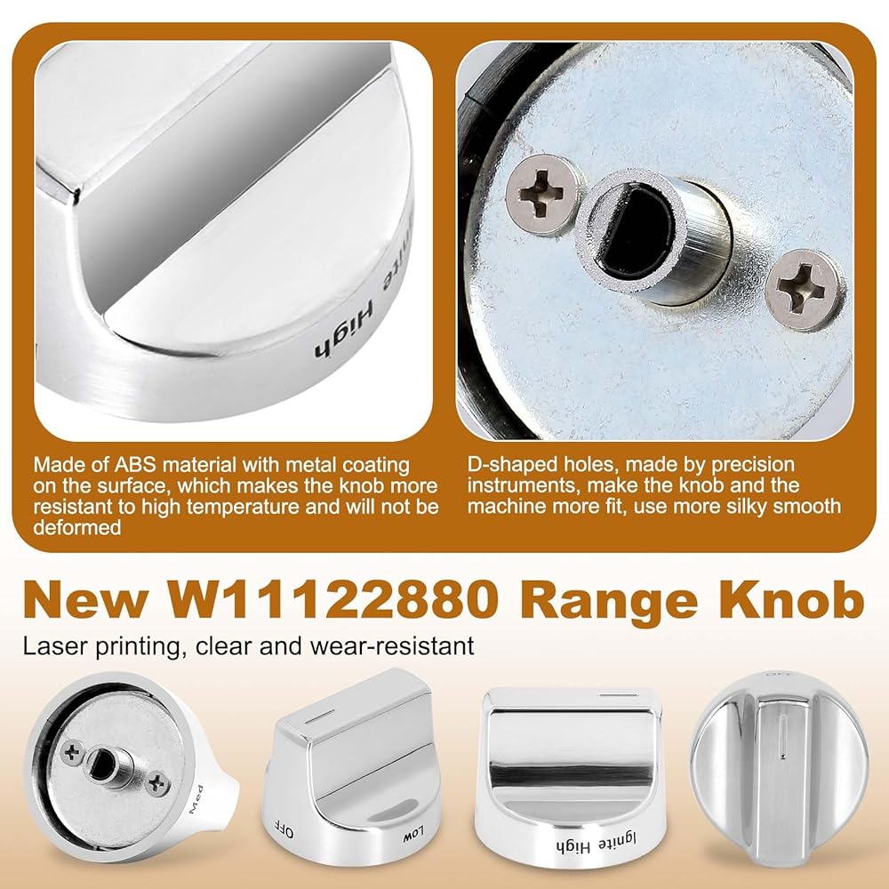 Upgraded Design: Our whirlpool W11122880 knobs replacement has undergone an electroplating and polishing process for improved aesthetics and high-temperature resistance, making them a great addition to any kitchen.
