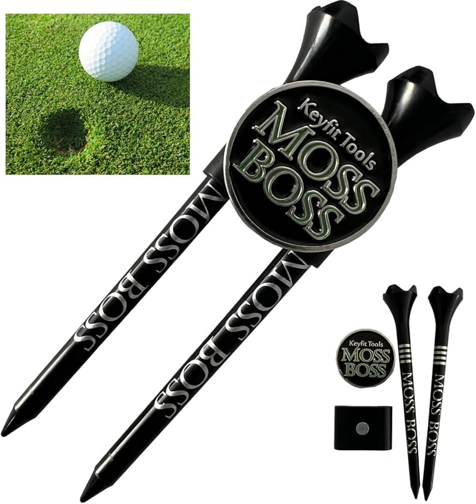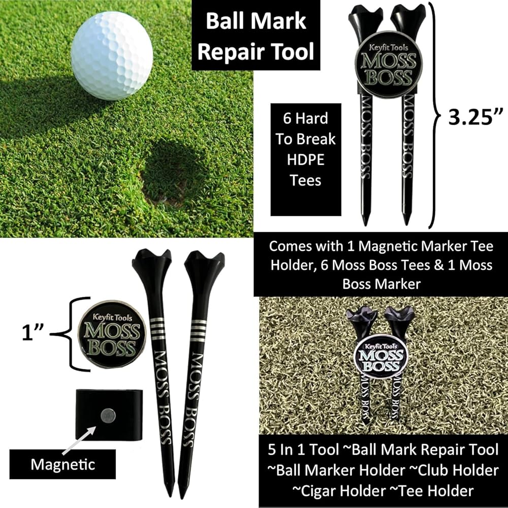 Eliminates The Need For A Ball Mark Repair Tool. Combines Everything Into One Easy Package ~Use The Moss Boss Logo On The Tees For Repeatable Tee Hight