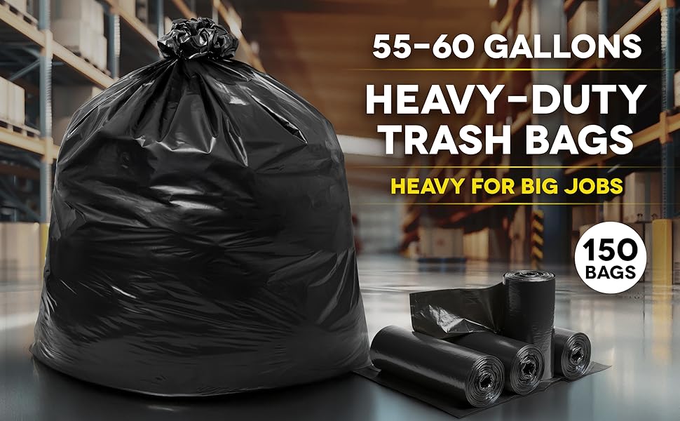 Large Trash Bags 55-60 Gallon | 150 Count, Heavy Duty Black Garbage Bags | Unscented, Leak Proof, Bulk Pack for Office, Industrial & Commercial Use - Made in USA