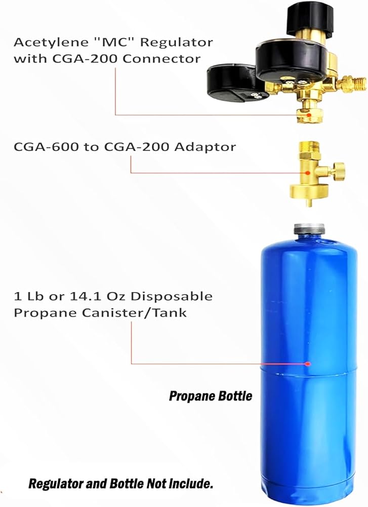 The Propane adaptor with Valve is intended to attach a 1 Lb or 14.1 Oz Disposable Propane or MAPP Tank/Canister with CGA-600 thread to an Acetylene Regulator with CGA-200 Connector (Type "MC").